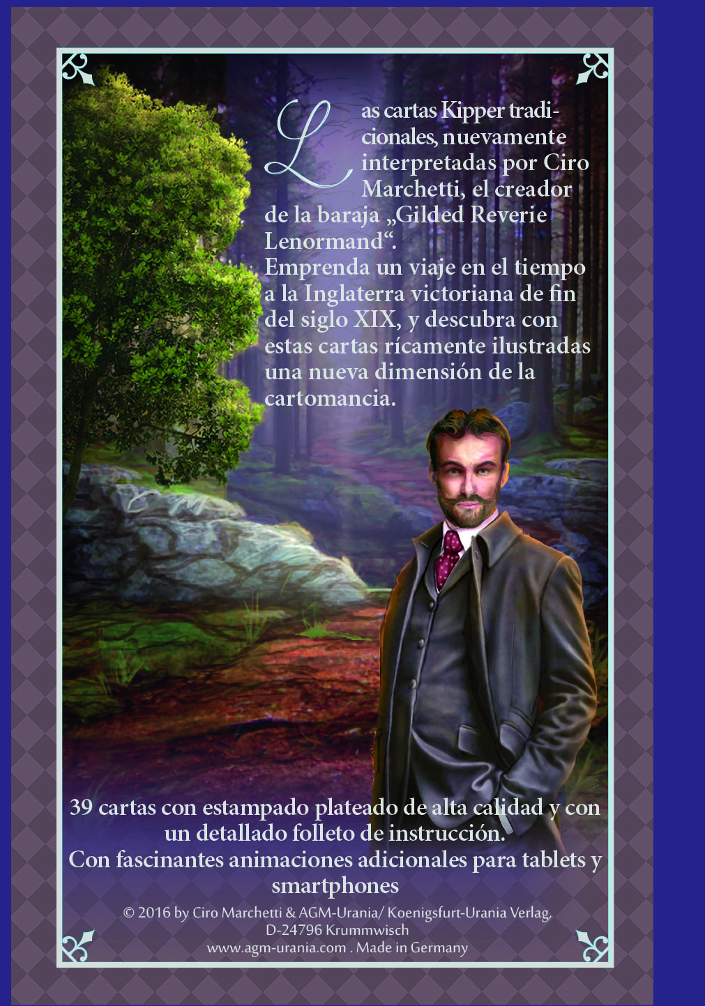 "Ciro Marchetti has situated the traditional German fortune telling deck at the turn of the 19th century in Victorian England.In this expanded deck with three additional cards, rich images tell the stories of the workers as well as thewealthy during the Industrial Revolution. Using augmented reality, via the Aurasma application, Ciro has brought the Fin de Siècle cards to life in stunning, new ways.Las cartas Kipper tradicionales, nuevamente interpretadas por Ciro Marchetti, el creador de la baraja "Gilded Reverie Lenormand". Emprenda un viaje en el tiempo a la Inglaterra victoriana de fin del siglo XIX, y descubra con estas cartas rícamente ilustradas una nueva dimensión de la cartomancia. 39 cartas con estampado plateado de alta calidad y con un detallado folleto de instrucción. Con fascinantes animaciones adicionales para tablets y smartphones."