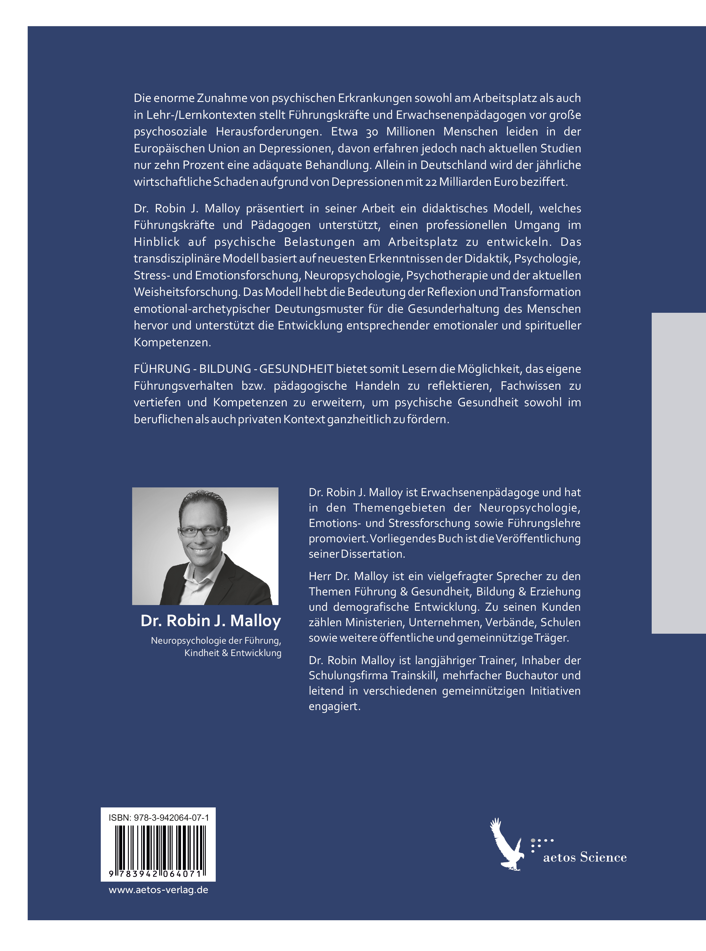 Dr. Robin J. Malloy ist Erwachsenenpädagoge und hat in den Themengebieten der Neuropsychologie, Emotions- und Stressforschung sowie Führungslehre promoviert. Vorliegendes Buch ist die Veröffentlichung seiner Dissertation. Herr Dr. Malloy ist ein vielgefragter Sprecher zu den Themen Führung & Gesundheit, Bildung & Erziehung und demografische Entwicklung. Zu seinen Kunden zählen Ministerien, Unternehmen, Verbände, Schulen sowie weitere öffentliche und gemeinnützige Träger. Dr. Robin Malloy ist langjähriger Trainer, Inhaber der Schulungsfirma Trainskill, mehrfacher Buchautor und leitend in verschiedenen gemeinnützigen Initiativen engagiert.