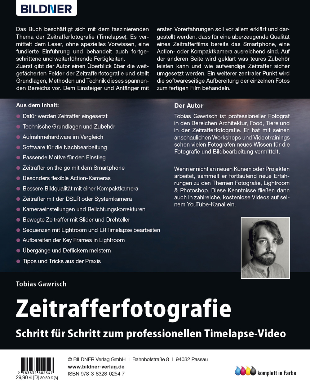 Das Buch beschäftigt sich mit dem faszinierenden Thema der Zeitrafferfotografie (Timelapse). Es vermittelt dem Leser, ohne spezielles Vorwissen, eine fundierte Einführung und behandelt auch fortgeschrittene und weiterführende Fertigkeiten.