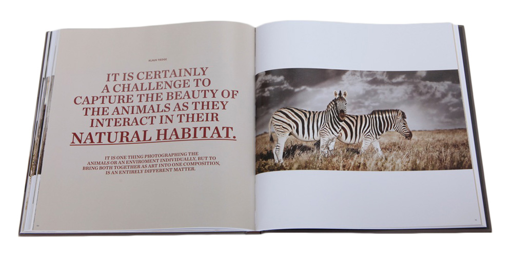 Leading photographer Klaus Tiedge combines the freshness of Africa's people and animals in their natural environments with his precise Teutonic touch. This gives a revitalised cover feel to his shots. His signature desaturation of colour perfectly showcases the region’s spectacular natural beauty, whether it’s storm clouds building up over the Okavango or smouldering sunsets over Etosha. Der Künstler und Fotograf Klaus Tiedge präsentiert in diesem Bildband seine ausgewählten Fotografien der Kollektion "Pride of Africa", die auch als limitierte Kunstdrucke erhältlich sind. Auf 142 Seiten werden atemberaubend und bewegend schöne Tieraufnahmen präsentiert, welche Tiedge währen seiner Safari Reisen in Namibia, Botswana und Kenia aufgenommen hat. Zusätzlich finden sich in diesem Bildband charakterstarke Portraits der traditions Völker Himba, Maasai und San. Pride of Africa fasst mit seiner einzigartigen Herangehensweise die Faszination und Schönheit Afrikas in einem Werk zusammen.