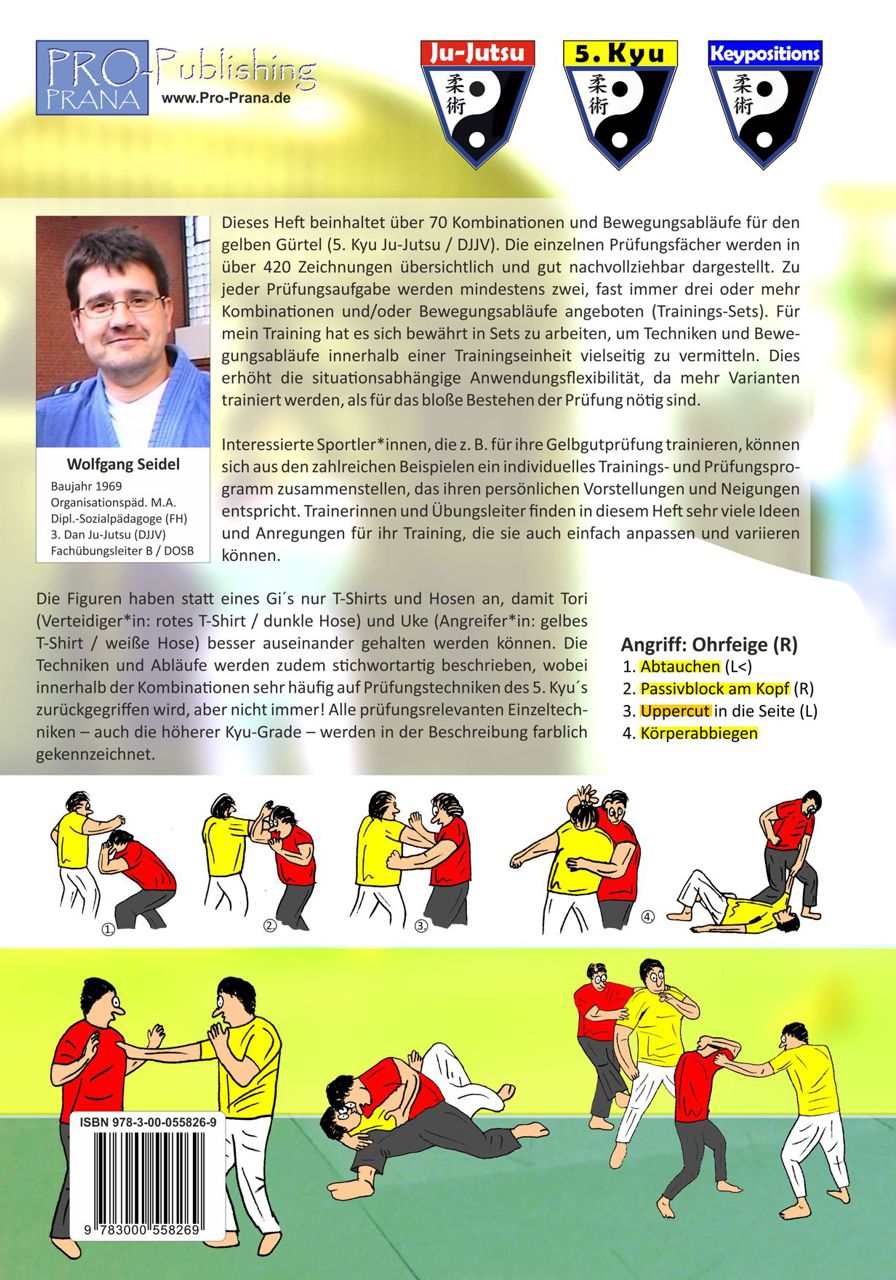 Die Figuren haben statt eines Gi´s nur T-Shirts und Hosen an, damit der Prüfling (rotes T-Shirt / dunkle Hose) und sein Partner (gelbes T-Shirt / weiße Hose) besser auseinander gehalten werden können. Die Techniken und Abläufe werden zudem stichwortartig beschrieben, wobei innerhalb der Kombinationen i. d. R. auf Prüfungstechniken des 5. Kyu´s zurückgegriffen wird, aber nicht immer! Alle prüfungsrelevanten Einzeltechniken – auch die höherer Kyu-Grade – werden in der Beschreibung farblich gekennzeichnet.