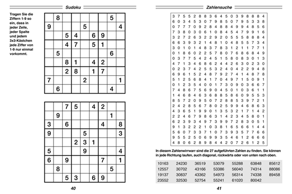 | Schlagworte | Fehlersuche • Gitterrätsel • Großdruckbände; Rätsel • Großschrift • Hobbys, Rätsel und Spiele • Kakuro • Knobeln • Kombirätsel • Kreuzworträtsel • Kreuzworträtselbuch • Kreuzworträtselheft • lösen • Magische Quadrate • Puzzle • Rätsel • Rätselbuch • Rätselheft • Rätselmix • Rätseln • Schüttelrätsel • Schwedenrätsel • Wabenrätsel • Wörterversteck • Zahlensuche |