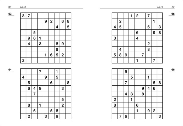 Das aus Japan kommende Rätsel Sudoku besteht aus neun quadratischen 3 x 3-Blöcken, wobei jeder quadratische Block in drei Reihen mit jeweils drei Kästchen unterteilt ist. In jedem quadratischen 3 x 3-Block sind Zahlen zwischen 1 und 9 vorgegeben. Diese vorgegebenen Zahlen gilt es so zu ergänzen, dass jede Zahl zwischen 1 und 9 nur einmal vorkommt. Auch in den neun Spalten und neun Zeilen des gesamten Sudoku-Rätsels dürfen die Zahlen von 1 bis 9 nur einmal vorkommen. Die Sudoku-Rätsel sind in die Schwierigkeitsstufen sehr leicht, leicht, mittelschwer, schwer und sehr schwer eingeteilt.