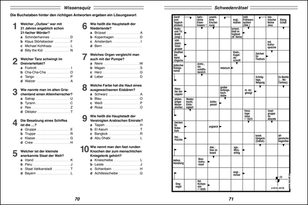 | Schlagworte | Fehlersuche • Gitterrätsel • Großdruckbände; Rätsel • Großschrift • Hobbys, Rätsel und Spiele • Kakuro • Knobeln • Kombirätsel • Kreuzworträtsel • Kreuzworträtselbuch • Kreuzworträtselheft • lösen • Magische Quadrate • Puzzle • Rätsel • Rätselbuch • Rätselheft • Rätselmix • Rätseln • Schüttelrätsel • Schwedenrätsel • Wabenrätsel • Wörterversteck • Zahlensuche |