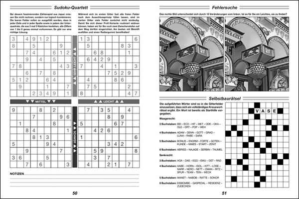 | Schlagworte | Fehlersuche • Gitterrätsel • Hobbys, Rätsel und Spiele • Kakuro • Knobeln • Kombirätsel • Kreuzworträtsel • Kreuzworträtselbuch • Kreuzworträtselheft • lösen • Magische Quadrate • Puzzle • Rätsel • Rätselbuch • Rätselheft • Rätselmix • Rätseln • Schüttelrätsel • Schwedenrätsel • Wabenrätsel • Wörterversteck • Zahlensuche |