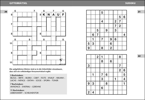 | Schlagworte | Fehlersuche • Gitterrätsel • Hobbys, Rätsel und Spiele • Kakuro • Knobeln • Kombirätsel • Kreuzworträtsel • Kreuzworträtselbuch • Kreuzworträtselheft • lösen • Magische Quadrate • Puzzle • Rätsel • Rätselbuch • Rätselheft • Rätselmix • Rätseln • Schüttelrätsel • Schwedenrätsel • Wabenrätsel • Wörterversteck • Zahlensuche |