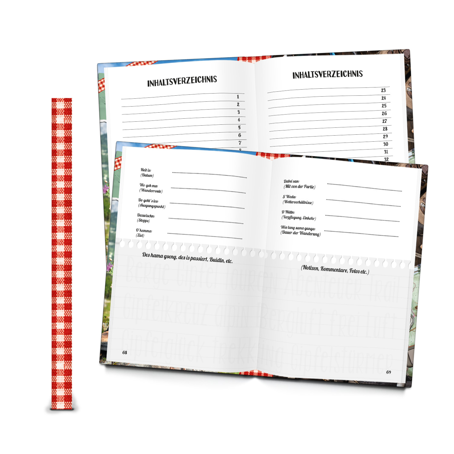 Wanderbuch (Hardcover A5) mit 136 Seiten zum festhalten von Erlebnissen, Auflügen, Tipps und Erinnerungen; das perfekte Geschenk zu Geburtstag, Weihnachten uvm. Grammatur 115g hochwertiges, weißes Recyclingpapier. Jede Seite des Buchs ist liebevoll gestaltet mit bayerischen Begriffen inkl. Übersetzung ins Hochdeutsche. Die Seiten sind nummeriert und am Ende ist ein Inhaltsverzeichnis.