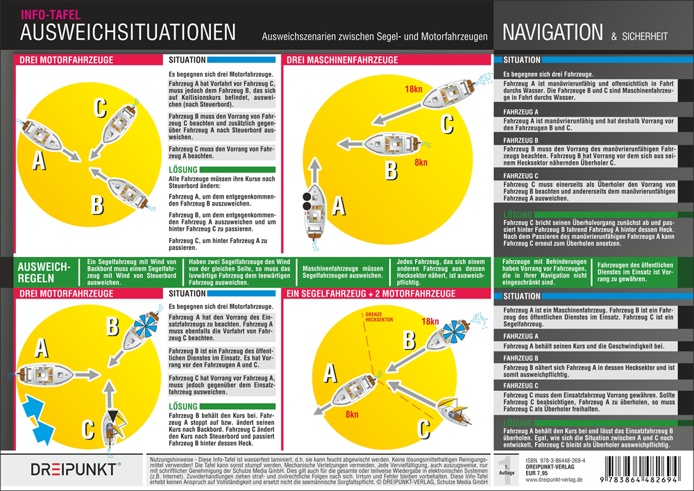 | Schlagworte | Ausweichen • Ausweichen auf See • Ausweichregeln • Ausweichsituationen • Binnen • Bootfahren • Dreipunkt • Dreipunkt-Verlag • Info-Tafel • Kollisionsverhütungsregeln • KVR • Motorbootsport • praxisnah • Recht vor Links • Schiffahrt • See • Segel-Ausbildung • Segeln • Segelschule • Sportboot |