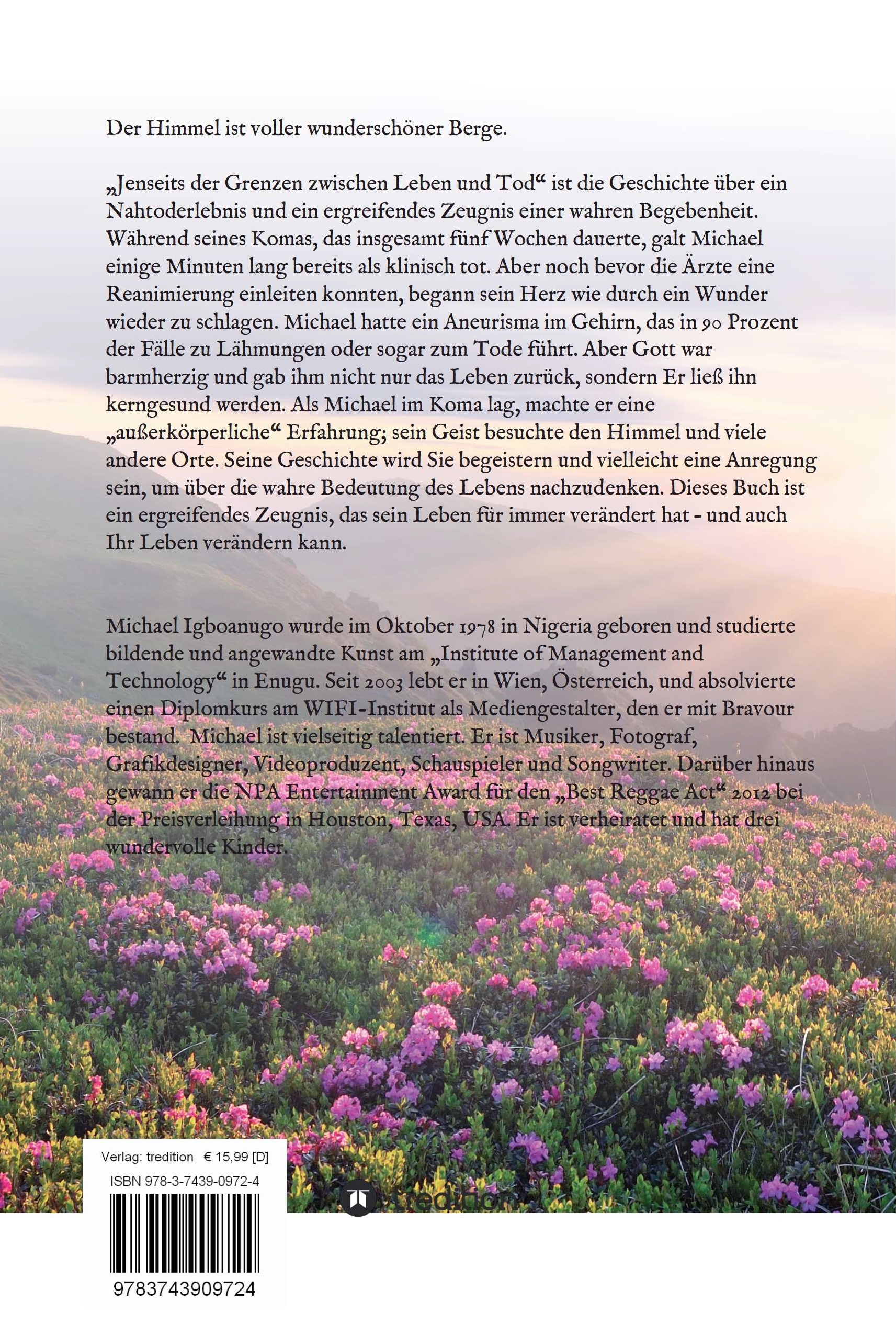 Der Himmel ist voller wunderschöner Berge."Jenseits der Grenzen zwischen Leben und Tod" ist die Geschichte über ein Nahtoderlebnis und ein ergreifendes Zeugnis einer wahren Begebenheit. Während seines Komas, das insgesamt fünf Wochen dauerte, galt Michael einige Minuten lang bereits als klinisch tot. Aber noch bevor die Ärzte eine Reanimierung einleiten konnten, begann sein Herz wie durch ein Wunder wieder zu schlagen. Michael hatte ein Aneurisma im Gehirn, das in 90 Prozent der Fälle zu Lähmungen oder sogar zum Tode führt. Aber Gott war barmherzig und gab ihm nicht nur das Leben zurück, sondern Er ließ ihn kerngesund werden. Als Michael im Koma lag, machte er eine "außerkörperliche" Erfahrung; sein Geist besuchte den Himmel und viele andere Orte. Seine Geschichte wird Sie begeistern und vielleicht eine Anregung sein, um über die wahre Bedeutung des Lebens nachzudenken. Dieses Buch ist ein ergreifendes Zeugnis, das sein Leben für immer verändert hat - und auch Ihr Leben verändern kann.