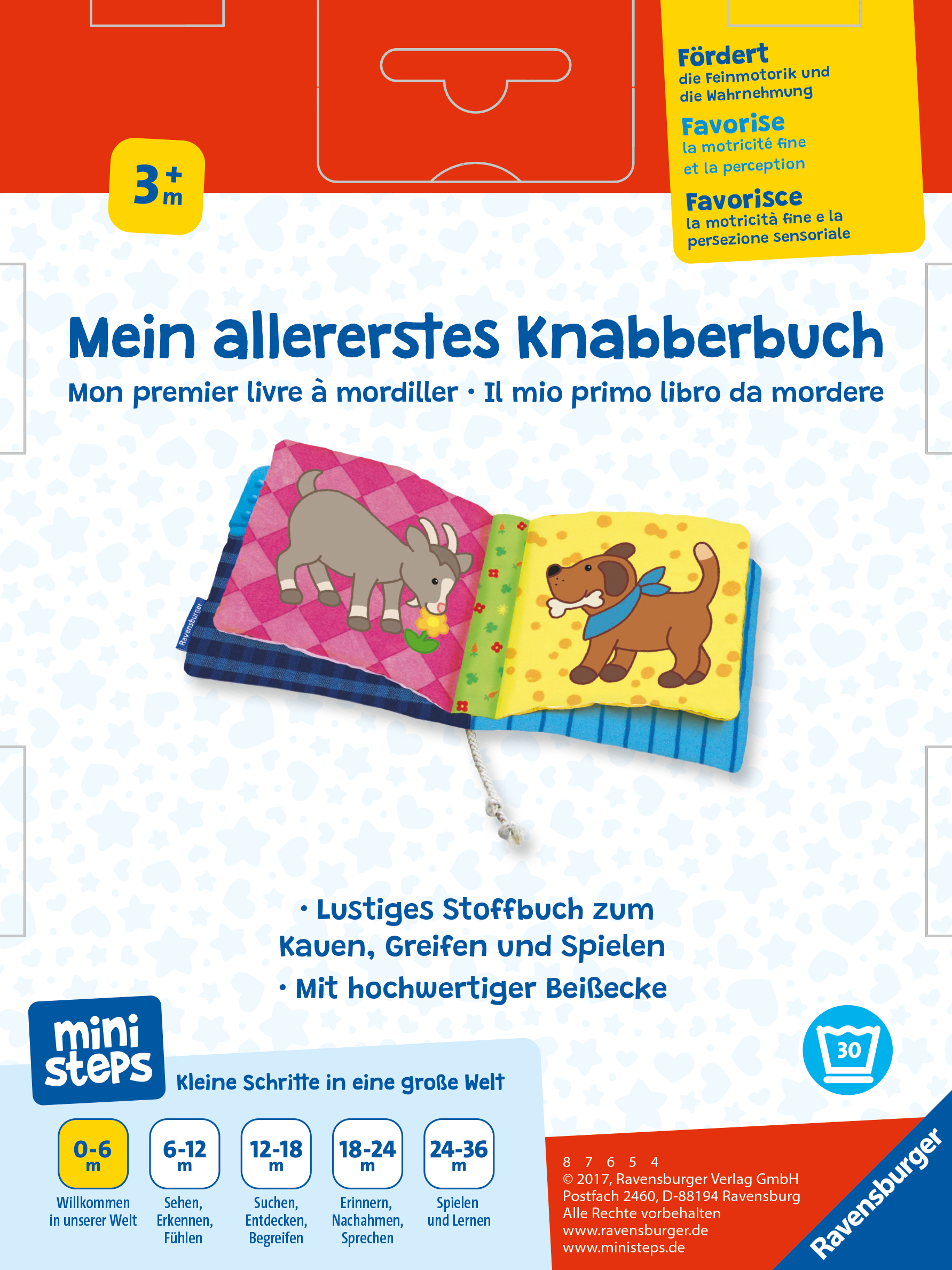 Das Kuschelbuch ist für Babys leicht zu greifen. Die genoppte Kunststoff-Ecke ist fest mit dem Buch verbunden und hilft, wenn die ersten Zähnchen kommen.