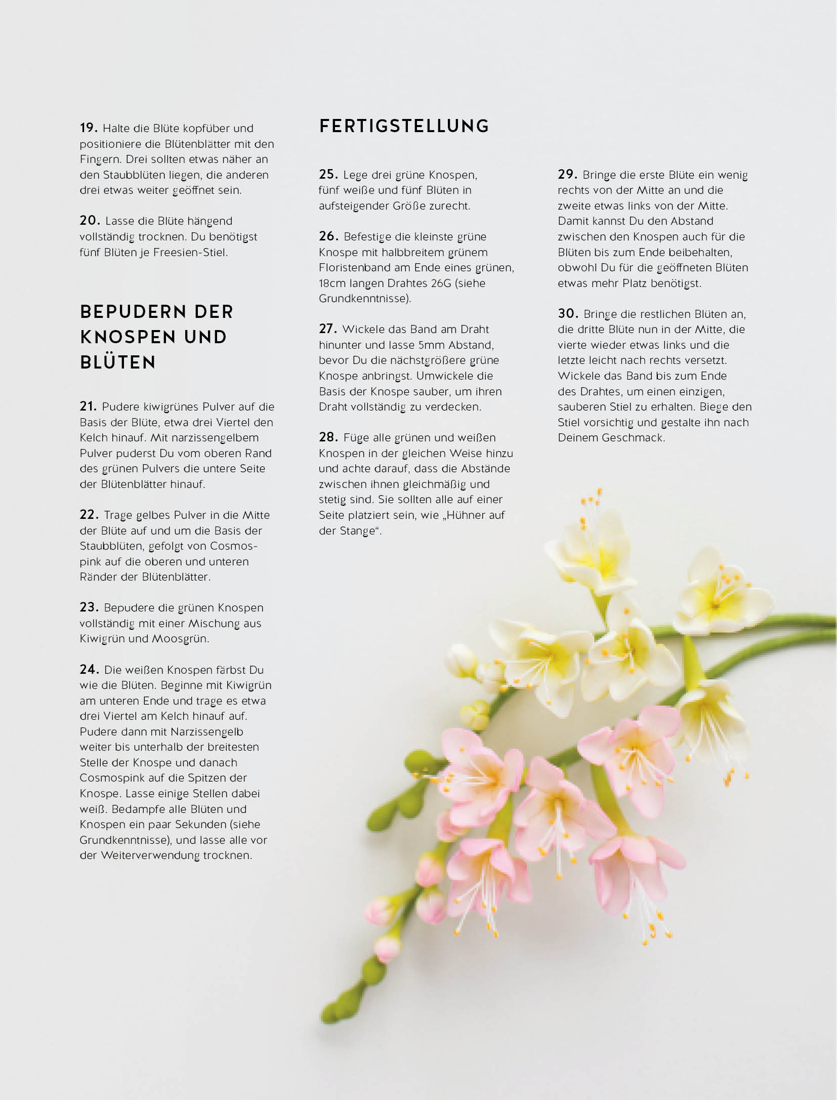 Durch über 600 hochwertige Fotos erfährst Du, wie 18 stilisierte Blumen aus Zuckermassen in verschiedenen Blütenphasen sowie Knospen und Blättern mit einer frischen, modernen Farbpalette kreiert werden.