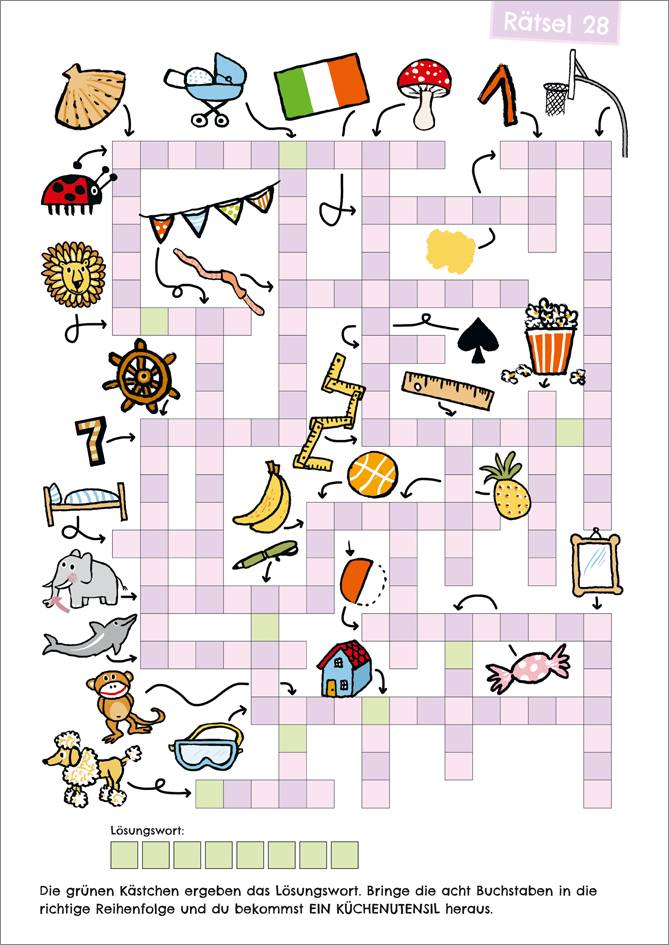 Mit diesen schönen bunten Rätseln wird das Gedächtnis trainiert und zugleich das Schreiben geübt. Einfach den Pfeilen folgen und zu jedem Bild das richtige Wort in das Kreuzwortgitter setzen! Sind alle Wörter eingetragen, ergibt sich das Lösungswort von selbst. Die Ergebnisse können im Lösungsteil auf den letzten Seiten des Heftes überprüft werden.