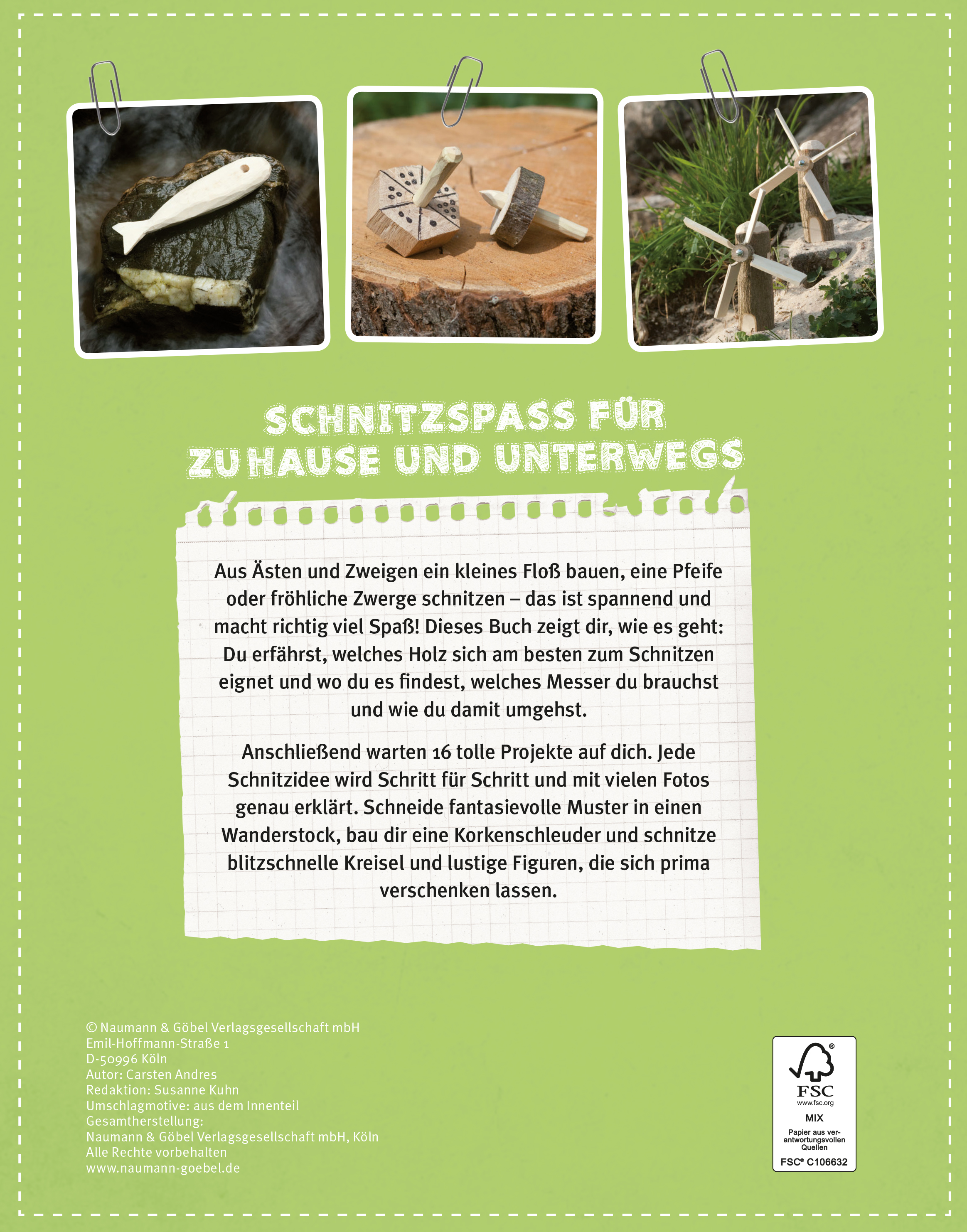 Aus Ästen und Zweigen ein kleines Floß bauen, eine Pfeife oder fröhliche Zwerge schnitzen - das ist spannend und macht richtig viel Spaß! Dieses Buch zeigt, wie es geht: Welches Holz eignet sich am besten zum Schnitzen und wo findet man es? Welches Messer braucht man und wie geht man damit um? Anschließend warten 16 tolle Projekte auf ihre Umsetzung. Jede Schnitzidee wird Schritt für Schritt und mit vielen Fotos genau erklärt, zum Beispiel wie man fantasievolle Muster in einen Wanderstock schneidet, wie man eine Korkenschleuder baut und wie man blitzschnelle Kreisel und lustige Figuren schnitzt, die sich prima verschenken lassen.