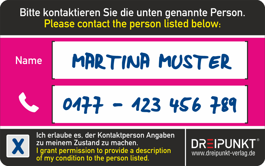 | Schlagworte | Allein • Ansprechpartner • Benachrichtigen • Dreipunkt • Dreipunkt-Verlag • Ersthelfer • ICE • In Case of Emergency • Karte • Katze • Kontaktperson • Kümmern • Kunststoff • Notfall • Notfallkarte • Notfall; Nonbooks • persönliche Sicherheit • PVC • Scheckkarte • Sicherheit • Unfall • Versorgung • zu Hause |