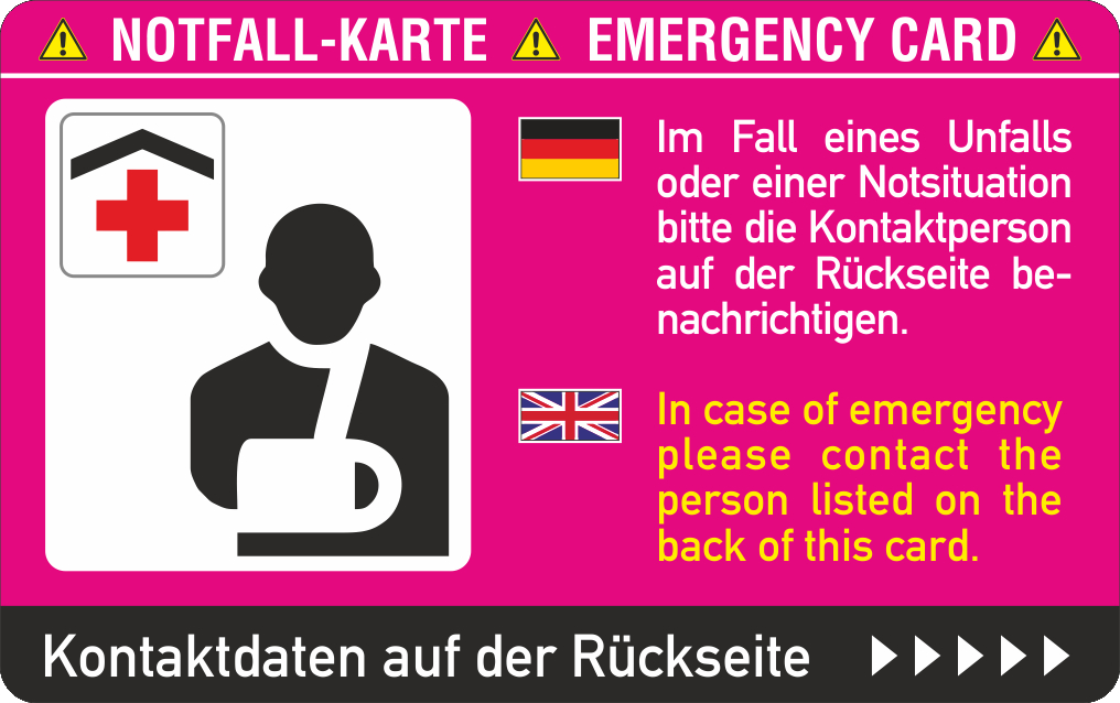 Bei einem Unfall oder einem medizinischen Notfall ist es wichtig, dass eine Kontaktperson für Polizei oder Rettungsdienste erreichbar ist. Diese scheckkartengroße Notfallkarte hat Platz in Ihren Papieren oder in der Brieftasche. Dies sind die Orte, an denen Rettungsdienste nach Kontaktdaten suchen, gerade wenn das Smartphone gesichert, defekt oder nicht greifbar ist. Tragen Sie die Daten der Kontaktperson ein, die sich bei einem Notfall um Ihre Angelegenheiten kümmern kann! Neben den Kontaktdaten können Sie in einem Ankreuzfeld festlegen, ob der Kontaktperson den Haustürschlüssel ausgehändigt werden darf. Mit dieser Notfallkarte stellen Sie sicher, dass die richtige Kontaktperson schnell und unkompliziert erreicht werden kann.