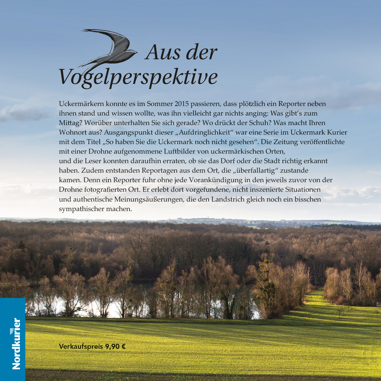 Uckermärkern konnte es im Sommer 2015 passieren, dass plötzlich ein Reporter neben ihnen stand und wissen wollte, was ihn vielleicht gar nichts anging: Was gibt´s zum Mittag? Worüber unterhalten Sie sich gerade? Wo drückt der Schuh? Was macht Ihren Wohnort aus? Ausgangspunkt dieser "Aufdringlichkeit" war eine Serie im Uckermark Kurier mit dem Titel "So haben Sie die Uckermark noch nicht gesehen". Die Zeitung veröffentlichte mit einer Drohne aufgenommene Luftbilder von uckermärkischen Orten, und die Leser konnten daraufhin erraten, ob sie das Dorf oder die Stadt richtig erkannt haben. Zudem entstanden Reportagen aus dem Ort, die "überfallartig" zustande kamen. Ein Reporter fuhr ohne jede Vorankündigung in den jeweils zuvor von der Drohne fotografierten Ort. Er erlebt dort vorgefundene, nicht inszenierte Situationen und authentische Meinungsäußerungen, die den Landstrich gleich noch ein bisschen sympathischer machen.
