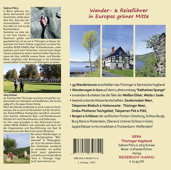 Sabine Flöry, in Berlin geboren, studierte Germanistik und Geschichte, stellte dann aber fest, dass das Lehrerinnendasein nicht ihre Welt ist und wurde Buchhändlerin. Nachdem sie viele Jahre mit ihrer Familie in Österreich gelebt und gearbeitet hat, ist sie nun in Thüringen zu Hause. Gemeinsam mit ihrem Partner organisiert sie beim Veranstalter REISE-KARHU Rad- & Wanderreisen, unter anderem auch nach Tschechien. Und auf einer dieser Touren entstand an einem ziemlich kalten Tag im Šumava die Idee, mithilfe unserer Reise- und Wanderführer möglichst viele Reiselustige in die schönsten Landschaften Tschechiens und Thüringens zu locken.