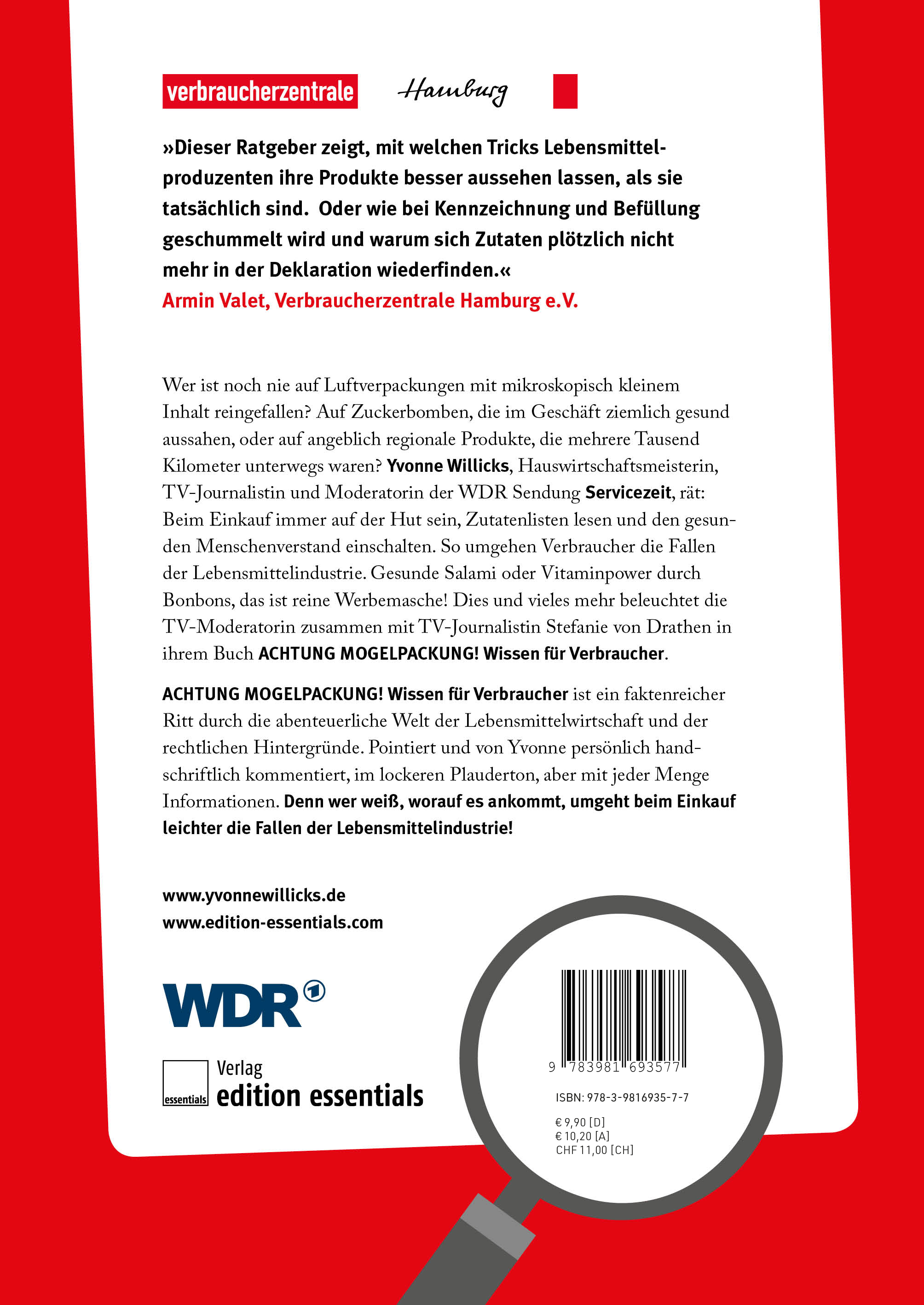 Der ultimative Einkaufsratgeber von Yvonne Willicks: ACHTUNG MOGELPACKUNG! Wissen für VerbraucherMit dem Band ACHTUNG MOGELPACKUNG! Wissen für Verbraucher von Yvonne Willicks ist ein unverzichtbarer Wegweiser erschienen, der zuverlässig durch den Lebensmitteldschungel geleitet. Gemeinsam mit der Journalistin Stefanie von Drathen hat die Moderatorin der WDR Erfolgssendung Servicezeit und TV-Journalistin eine Fülle von Fakten, Hintergrundinfos und Tipps zusammengetragen, um die Tricks der Lebensmittelindustrie zu entlarven und dem Verbraucher den bewussten Einkauf zu erleichtern.