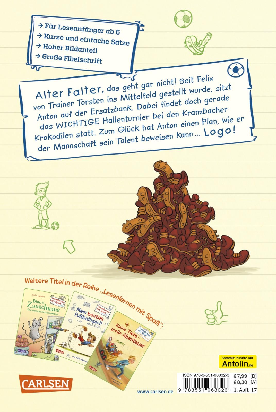 Alter Falter, das geht gar nicht! Seit Trainer Torsten Felix vom Tor ins Mittelfeld gestellt hat, sitzt Anton auf der Ersatzbank. Dabei findet doch gerade das WICHTIGE Hallenturnier bei den Kranzbacher Krokodilen statt. Zum Glück hat Anton einen Plan, wie er der Mannschaft sein Talent beweisen kann ... Logo!