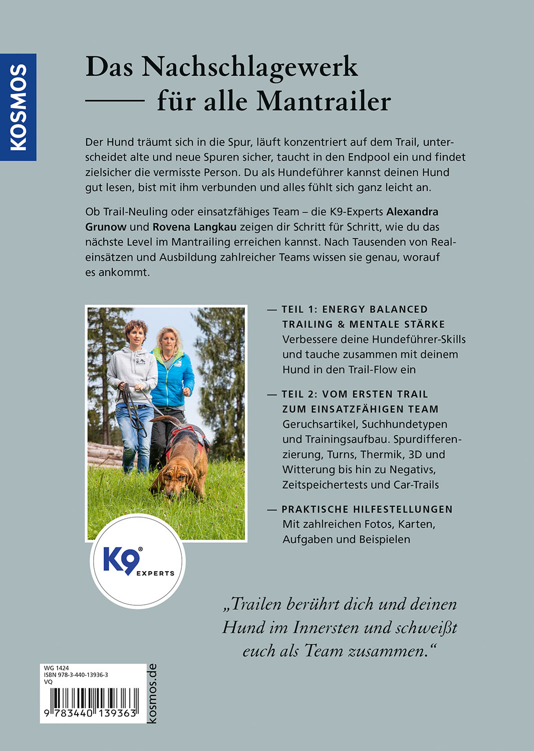 Der Trail-Flow ist der Schlüssel zum erfolgreichen Trailen! Alexandra Grunow und Rovena Langkau haben praktische Übungen über den Flow-Zustand, die Körpersprache des Hundes sowie die mentale Stärke des Mensch-Hund-Teams zusammengefasst. Des Weiteren geht es um Trailtechniken und Geruch, Besonderheiten auf den Trails, Trainingstipps auch zu unterschiedlichen Suchhundetypen und die Einsatzfähigkeit. Anhand von Fotos, Karten und Filmen lernen Einsteiger wie Profis ihren Hund zu lesen, ihn in seiner Arbeit zu unterstützen und gemeinsam zum Erfolg zu kommen. Ein Nachschlagewerk von der Basisausbildung bis zur Einsatzfähigkeit.