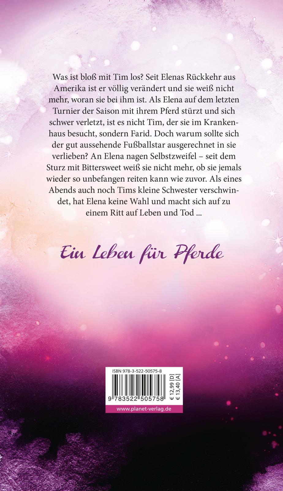 Was ist bloß mit Tim los? Seit Elenas Rückkehr aus Amerika ist er völlig verändert und sie weiß nicht mehr, woran sie bei ihm ist. Als Elena auf dem letzten Turnier der Saison mit ihrem Pferd stürzt und sich schwer verletzt, ist es nicht Tim, der sie im Krankenhaus besucht, sondern Farid. Doch warum sollte sich der gut aussehende Fußballstar ausgerechnet in sie verlieben? An Elena nagen Selbstzweifel - seit dem Sturz mit Bittersweet weiß sie nicht mehr, ob sie jemals wieder so unbefangen reiten kann wie zuvor. Als eines Abends auch noch Tims kleine Schwester verschwindet, hat Elena keine Wahl und macht sich auf zu einem Ritt auf Leben und Tod ...