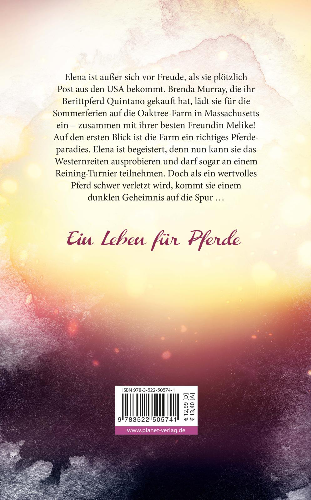 Elena ist außer sich vor Freude, als sie plötzlich Post aus den USA bekommt. Brenda Murray, die ihr Berittpferd Quintano gekauft hat, lädt sie für die Sommerferien auf die Oaktree-Farm in Massachusetts ein - zusammen mit ihrer besten Freundin Melike! Auf den ersten Blick ist die Farm ein richtiges Pferdeparadies. Doch als ein wertvolles Pferd schwer verletzt wird und die Tochter der Besitzerin verschwindet, kommt Elena einem dunklen Geheimnis auf die Spur ...