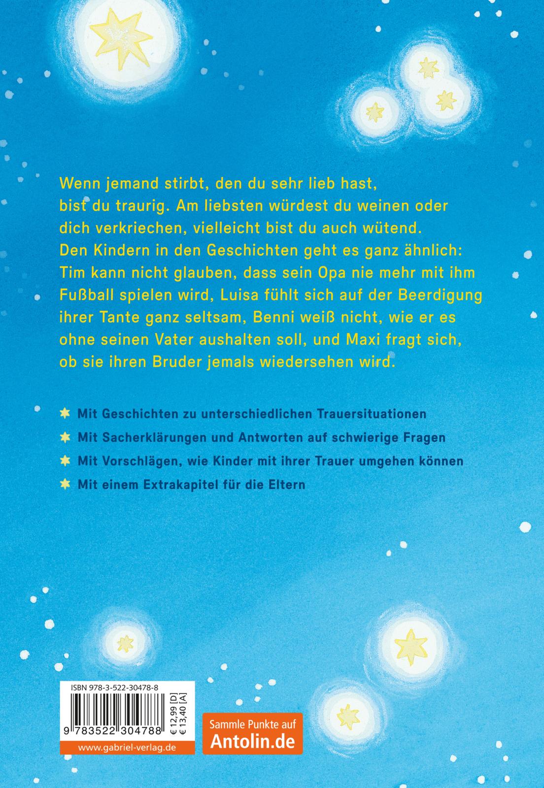 Diese Geschichten sind im Buch: Tim kann nicht glauben, dass sein Opa nie mehr mit ihm Fußball spielen wird, Luisa fühlt sich auf der Beerdigung ihrer Tante ganz seltsam, Benni weiß nicht, wie er es ohne seinen Vater aushalten soll, und Maxi fragt sich, ob sie ihren Bruder jemals wiedersehen wird.