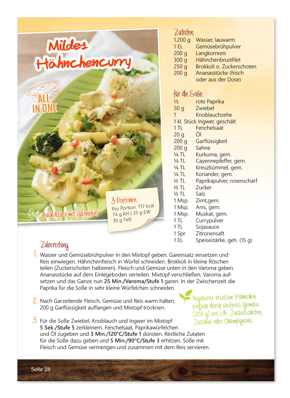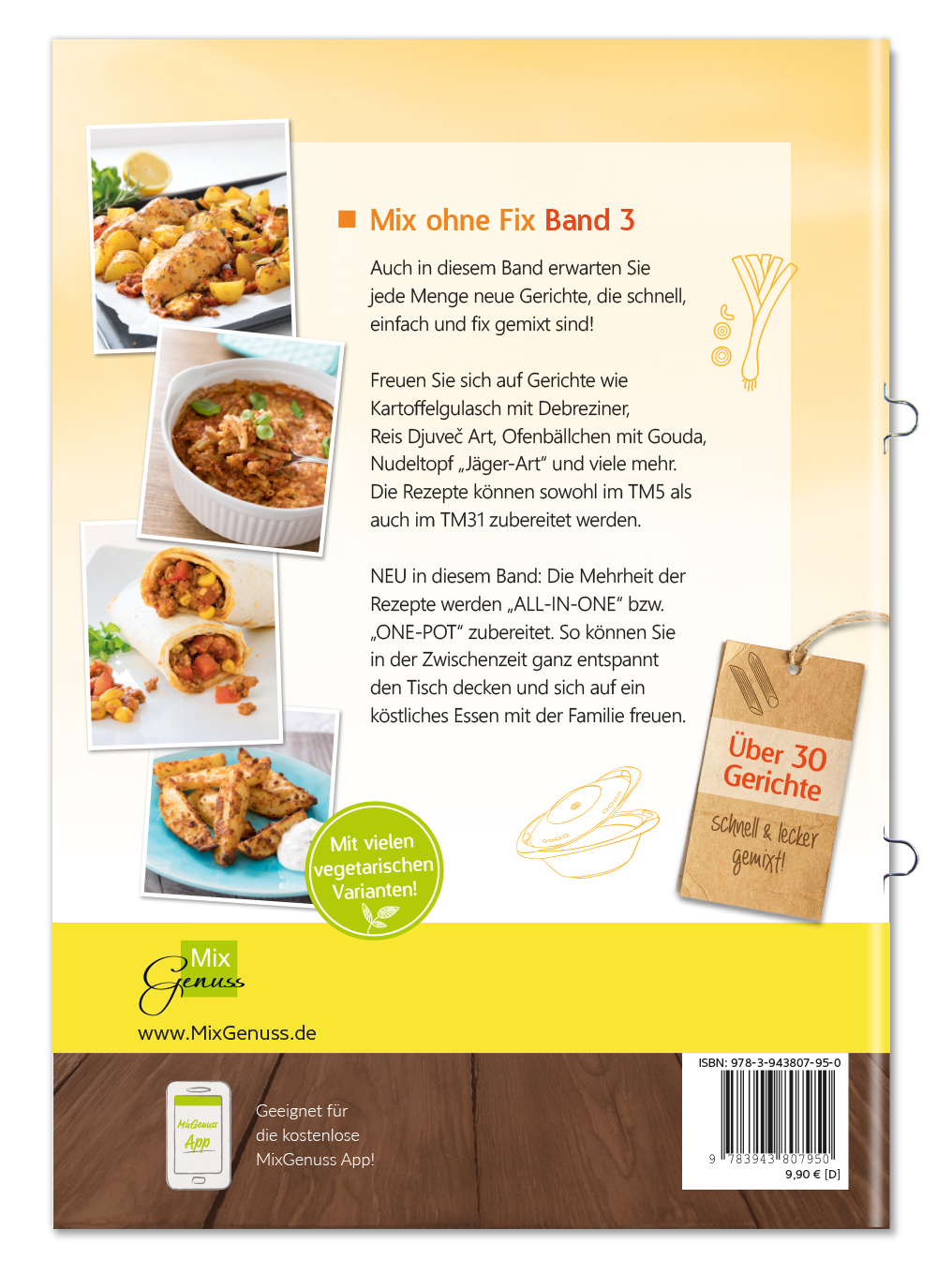 Auch in diesem Band erwarten Sie jede Menge neue Gerichte,die schnell, einfach und fix gemixt sind!Freuen Sie sich auf Gerichte wie Kartoffelgulasch mit Debreziner,Reis Djuvec Art, Ofenbällchen mit Gouda, Nudeltopf "Jäger-Art" und viele mehr.Die Rezepte können sowohl im TM5 als auch im TM31 zubereitet werden.NEU in diesem Band: Die Mehrheit der Rezepte werden "ALL-IN-ONE" bzw."ONE-POT" zubereitet. So können Sie in der Zwischenzeit ganz entspanntden Tisch decken und sich auf ein köstliches Essen mit der Familie freuen.Rezeptübersicht:Ofen-Gnocchi mit HackfleischBunter Makkaroni-AuflaufNudeltopf "Jäger Art"Kartoffelgulasch mit DebrezinerBolognesetopfBunte GemüsetagliatelleBrokkolipasta mit HackfleischPaprikahendl mit NudelnÜberbackene SchinkenfleckerlNudelauflauf "Carbonara"RatatouilleÜberbackenes Gemüse mit KartoffelnTomaten-Käse-MakkaroniSpaghetti "Rustica"Käse-Schinken-LasagneVegetarische GemüsepfanneOfenbällchen mit GoudaSchichtkohl mit HackfleischChina-Pfanne "Chop Suey"Reis "Djuvec Art" mit GeschnetzeltemSpargelgratin mit SchinkenZucchinipfanne "Mediterran"Erbsen-Karotten-GeschnetzeltesGemüsewraps mit HackfleischMildes HähnchencurryNudelpfanne mit Pute, Paprika & FrischkäseZwiebel-Rahm-SchnitzelRahm-Medaillons "Züricher Art"Ofen-Hähnchen vom BlechOfen-Lachs vom BlechWürzmischungen:für Pasta "Miracolix"für Rosmarinkartoffelnfür Salatfix