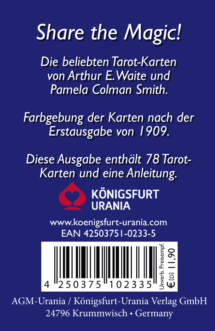 Diese weltweit bekanntesten und beliebtesten Tarotkarten wurden am Anfang des 20. Jahrhunderts von Arthur Edward Waite zusammen mit der Illustratorin Pamela Colman Smith gestaltet. Seitdem sind verschiedene Ausgaben dieses Tarot Kartendecks entstanden, mit etwas voneinander abweichender Farbgebung und unterschiedlichen Rückseiten. Diese Tarot Version in der blauen Faltschachtel hat als Kartenrückseite das Rosenkreuz auf blauem Grund. Sie enthält eine Anleitung à 32 Seiten mit Texten von Rachel Pollack u.a.Es gibt sie in den Formatgrößen Standard, Pocket und Mini.