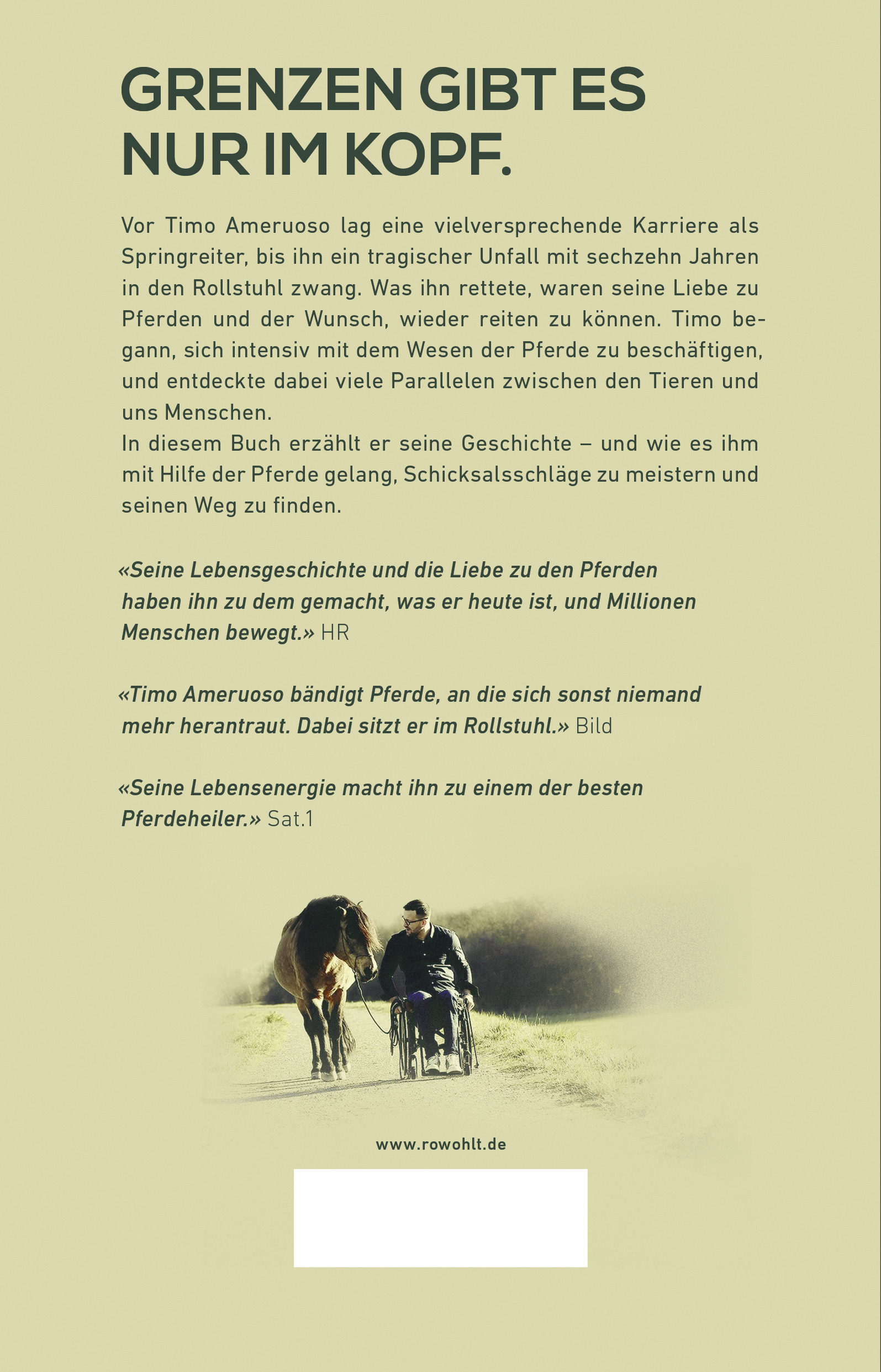 Vor Timo Ameruoso lag eine vielversprechende Karriere als professioneller Springreiter, bis ihn ein tragischer Unfall mit 16 Jahren in den Rollstuhl zwang. Was ihn rettete, war seine Liebe zu Pferden und der Wunsch, wieder reiten zu können. Timo begann, sich intensiv mit dem Wesen der Pferde zu beschäftigen, und entdeckte dabei viele Parallelen zwischen ihnen und uns Menschen. Fünf zentrale Eigenschaften hat er herausgefiltert, die ihm bei der Arbeit mit Pferden und im Leben als Ganzes weitergeholfen haben. In diesem Buch erzählt er anhand seiner eigenen Geschichte, wie es gelingen kann, trotz schwerster Schicksalsschläge seinen Weg zu gehen, um langfristig erfolgreich und glücklich zu werden – und zu bleiben.