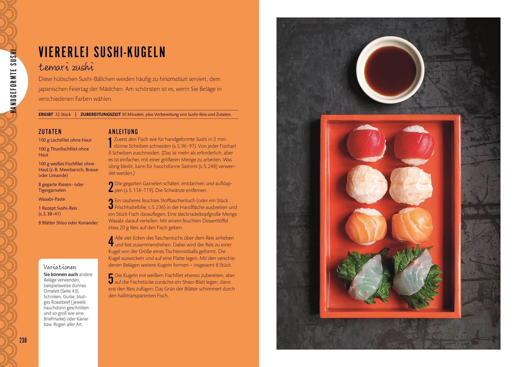 Zum Einstieg zeigen Ihnen die beiden erfahrenen Sushi-Experten Kimiko Barber und Hiroki Takemura die Basics über Warenkunde, Werkzeuge und Küchentechniken. Anschließend erfahren Sie in anschaulichen Stepbildern, wie Sie verschiedene Sushi wie Chirashi, Oshi, Inari, Maki und Nigiri selbst herstellen - egal ob gewickelt, gerollt oder in der Schale serviert.