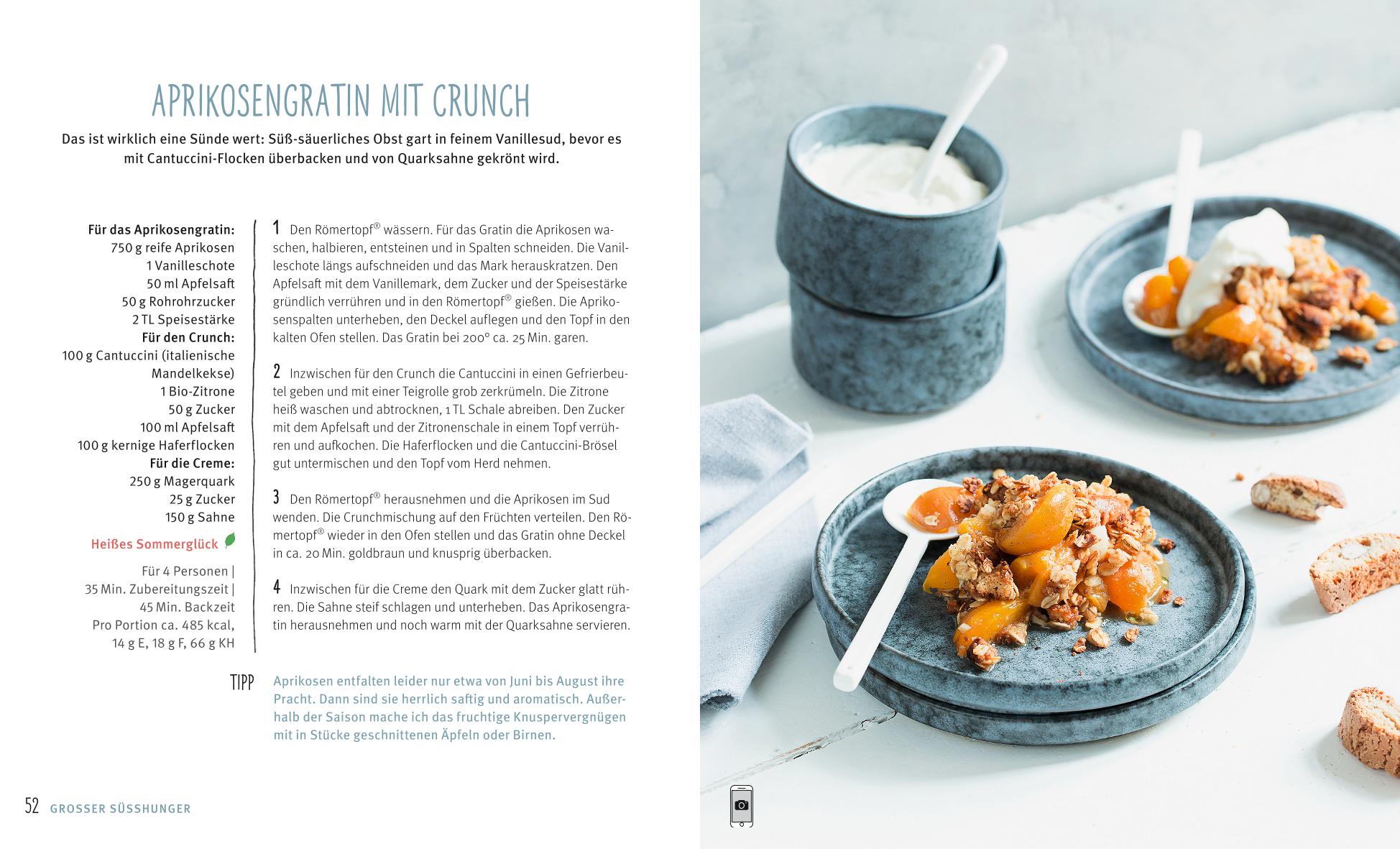 - Großer Süßhunger: Aprikosen-Gratin mit Crunch, Brotauflauf mit Zwetschgen, Kirsch-Clafoutis mit Kardamom, Bratapfel-Grießauflauf mit Marzipan, Mandelmilchreis mit Früchten