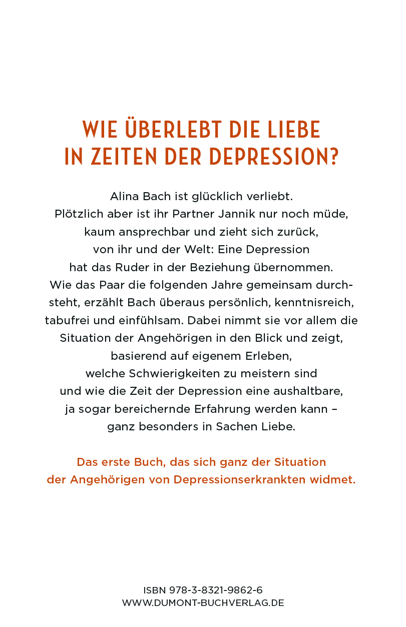 Neun Jahre lang begleitet Bach ihren Partner durch Düsternis und Erschöpfung und nennt es »unsere Reise durch Jannis’ dunkle Zeit«. Kenntnisreich, aufrichtig, überaus persönlich und unsentimental erzählt sie ihre Geschichte und möchte damit vor allem Angehörigen von Depressionserkrankten zur Seite stehen. Auf der Basis ihrer eigenen Erfahrung stellt sie deren Situation in den Mittelpunkt ihres Berichts. Bach erzählt von Sorgen, Ängsten und der Last des Alltags, aber auch davon, wie viel Hoffnung es gibt und wie die Zeit der Depression eine aushaltbare, ja sogar bereichernde Erfahrung werden kann – ganz besonders in Sachen Liebe.
