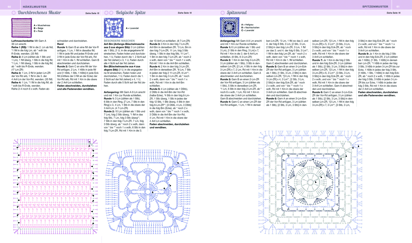 Jedes Häkelquadrat ist mit Angaben zum Schwierigkeitsgrad des Musters, einer Häkelschrift sowie einer detaillierten Schritt-für-Schritt- Anleitung versehen.