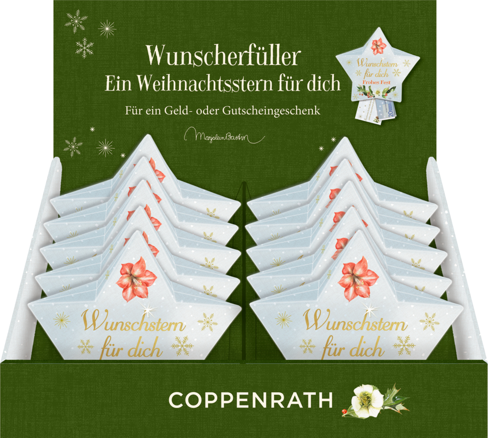 Dieser hochwertig gestaltete Faltstern kann Weihnachtswünsche erfüllen. In seinem Innern ist neben einem kleinen Leporello mit Widmungsmöglichkeit Platz für ein Geld- oder Gutscheingeschenk.
