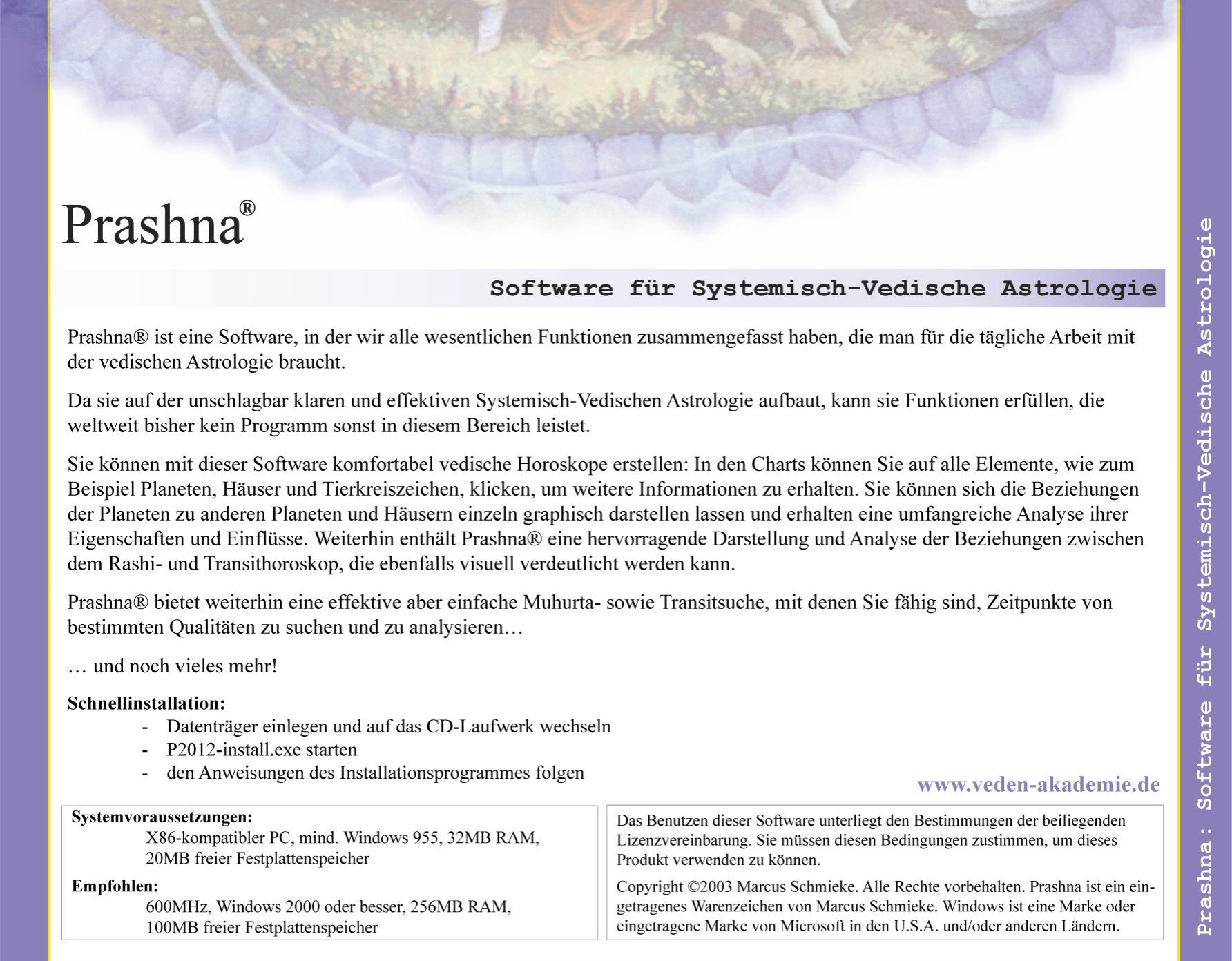In dieser Software für Vedische Astrologie haben wir alle wesentlichen Funktionen zusammengefasst, die man für die tägliche Arbeit mit der vedischen Astrologie braucht. Da Prashna auf der unschlagbar klaren und effektiven Systemisch-Vedischen Astrologie von Prof. V.K. Choudhrys aufbaut, kann es Funktionen erfüllen, die weltweit keine Software für Vedische Astrologie leistet. Die drei Ausbaustufen der Software enthalten u.a. die folgenden Features, wobei jede Version alle Funktionen der vorausgehenden Stufen umfasst. Dieses Programm funktioniert nur mit Windows-Betriebssystemen ab Windows XP oder darüber!