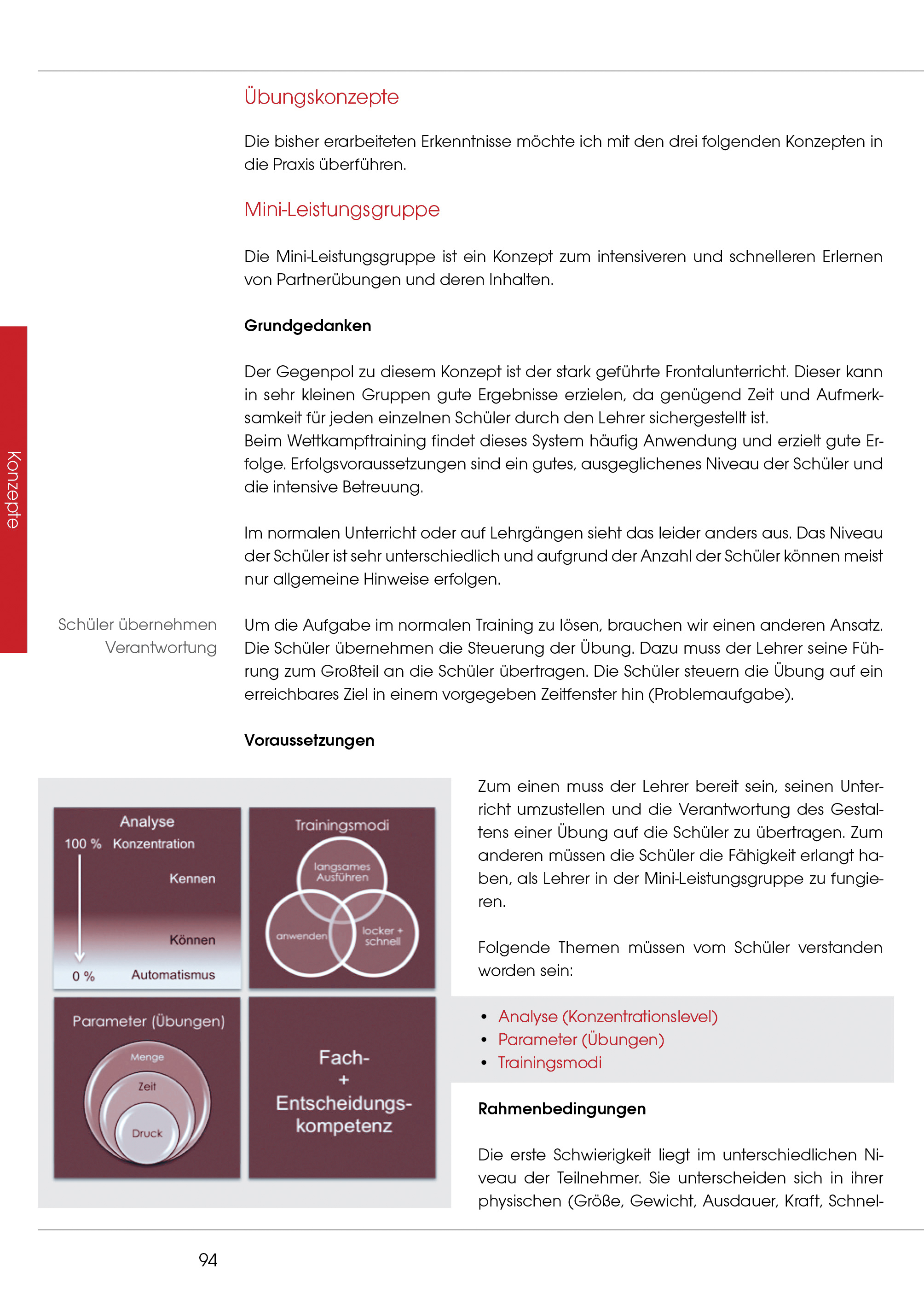 Arbeitsweisen, Methoden und Übungen werden als Bausteine vorgestellt, die sich in einfachen Funktionskreisen wiederfinden. Im Mittelpunkt steht dabei die Methodik zur Erweiterung der eigenen Fertigkeiten. Hier es vor allem um die Gestaltung konkreter Übungen, deren progressiver Anpassung und Variation.