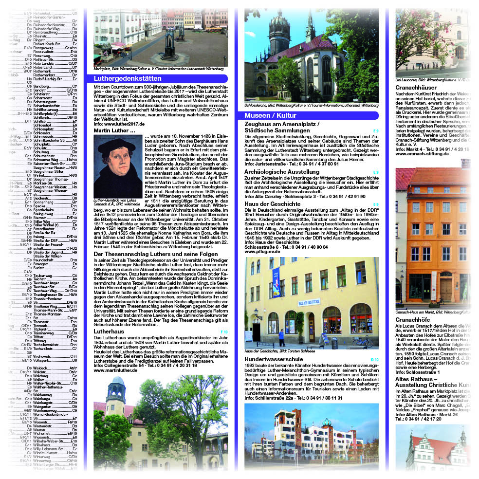 Auf den Spuren der Reformation durch Wittenberg spazieren: Mit dem 500-jährigen Jubiläum des Thesenanschlags im Jahr 2017 rückt die Lutherstadt Wittenberg in den Fokus der gesamten christlichen Welt. Alleine 4 UNESCO-Welterbestätten in Wittenberg und die umliegende einmalige Natur- und Kulturlandschaft Mittelelbe mit weiteren UNESCO-Welterbestätten verdeutlichen, warum Wittenberg wahrhaftes Zentrum der Weltkultur ist. Der Stadtplan lädt die Besucher dazu ein, auf den Spuren des großen Reformators, Dr. Martin Luther zu wandeln und sich von dem überall im historischen Stadtzentrum spürbaren Geist jener Zeit inspirieren zu lassen. Neben einer faszinierenden Fülle an herausragenden und geschichtsträchtigen Gebäuden, Kirchen und Museen begeistert die Lutherstadt auch mit dem schönsten und größten Schmetterlingspark und dem kleinsten Zoo Deutschlands.