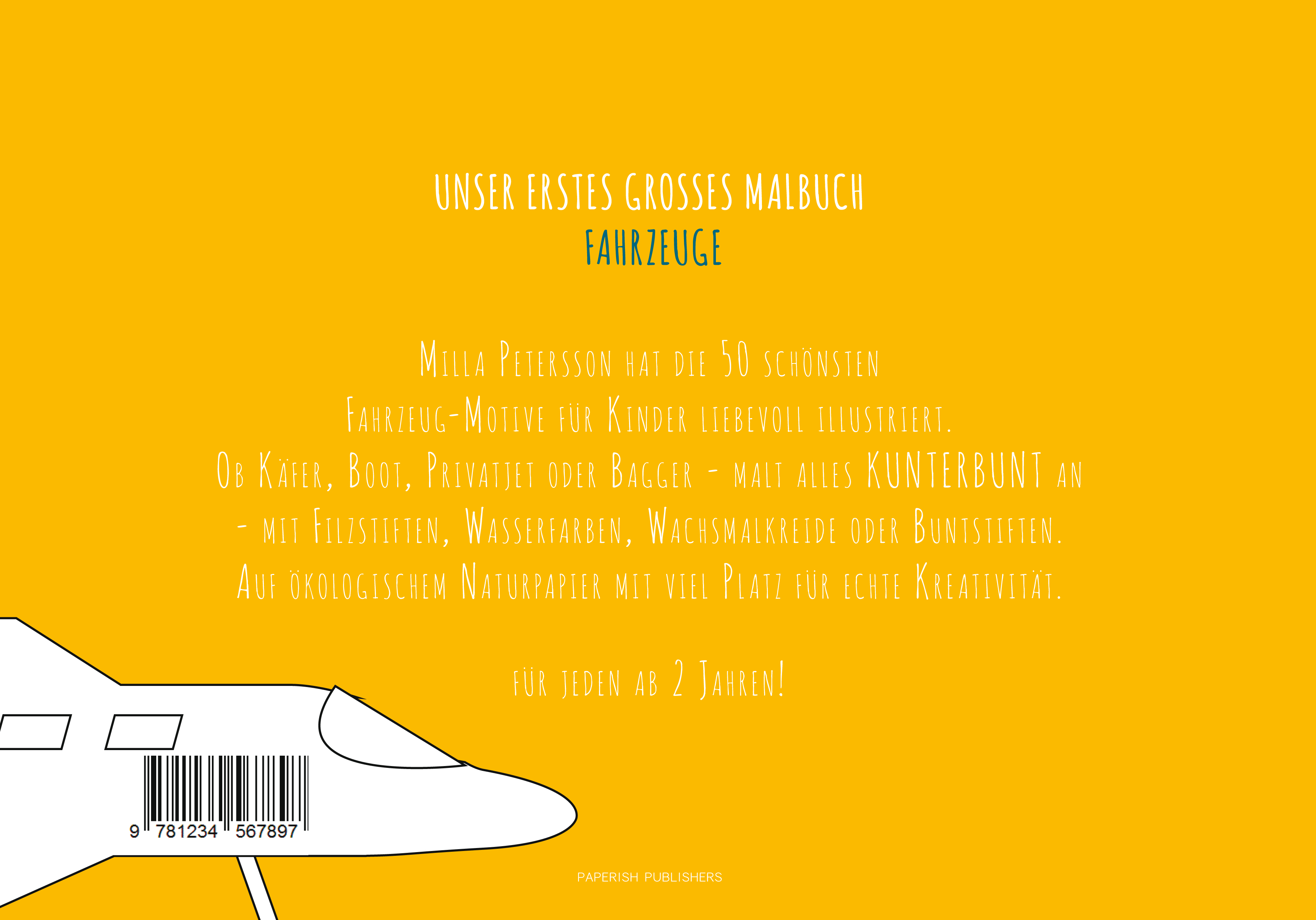 UNSER ERSTES GROSSES MALBUCH!Milla Petersson hat die 50 schönsten Fahrzeug-Motive für Kinder liebevoll und innovativ illustriert.Ob Käfer, Boot, Privatjet, oder Bagger - malt alles KUNTERBUNT an - mit Filzstiften, Wasserfarben, Wachsmalkreide oder Buntstiften. Hergestellt auf dickem Naturpapier mit viel Platz zum kreativen malen.Für jeden ab 2 Jahren!