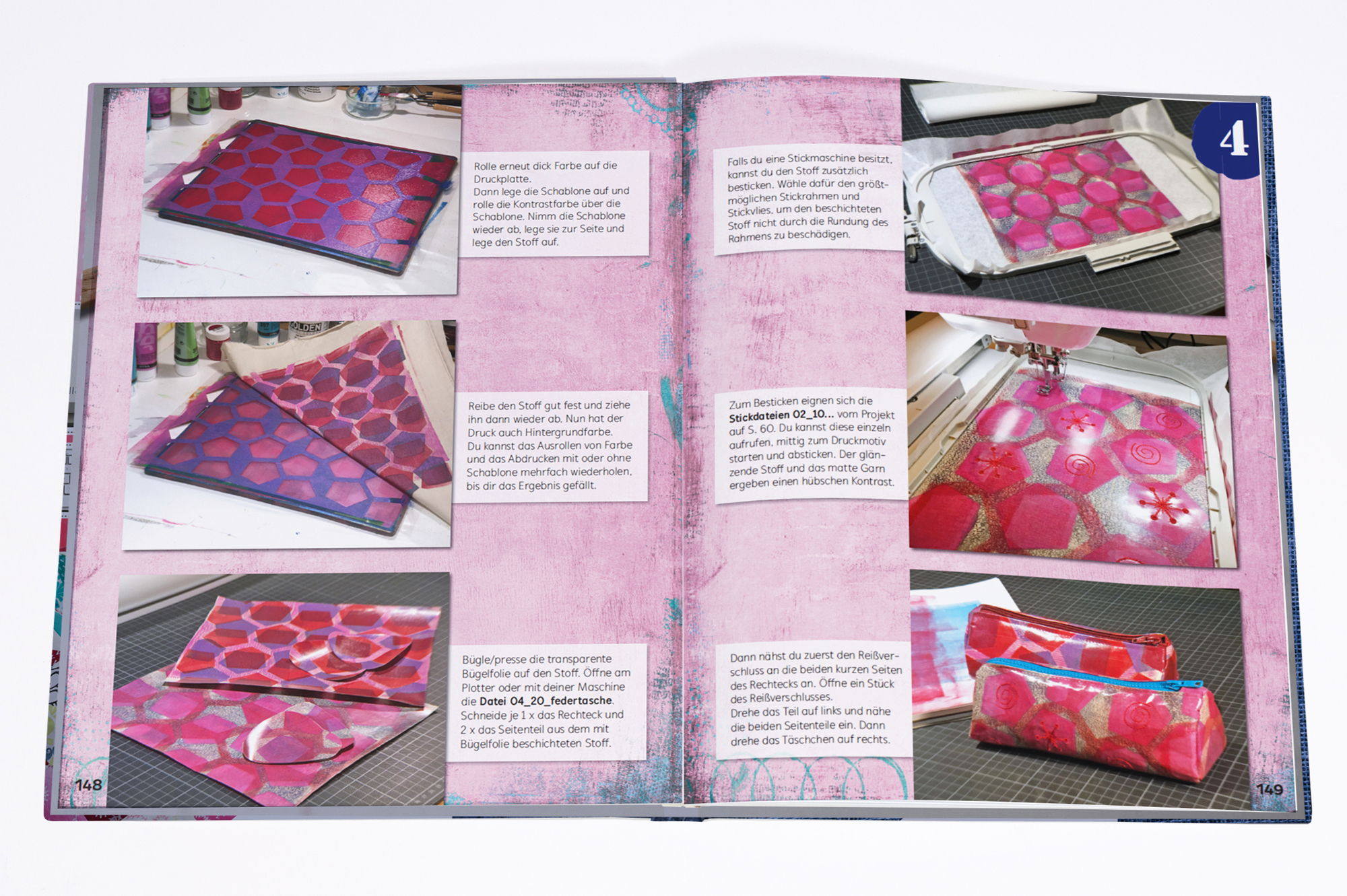 Dann wird es richtig bunt. Denn mit dem Plotter lassen sich auch Stempel, Schablonen und Masken schneiden, die zum Bedrucken und Einfärben von Textilien verwendet werden können. Die Autorin zeigt jeweils die benötigten Werkzeuge, Materialien und Stofffarben und erklärt die einzelnen Techniken anhand vieler Farbfotos.