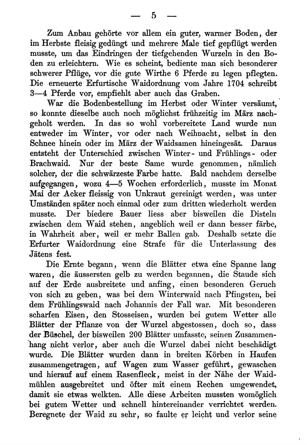 Die machtvolle und angesehene Stellung, welche Erfurt früher in politischer Beziehung in Deutschland einnahm, lässt sich in erster Linie nur durch das Vorhandensein erheblichen Reichthums erklären. Geld war Macht, wie heute so damals. Nur durch bedeutende Mittel war es möglich, dass die Stadt ihr Gebiet so vergrösserte, dass sie schliesslich gegen hundert Ortschaften und nicht wenige feste Schlösser und Burgen besass, dass sie, vielleicht als erste in Deutschland, Söldner-Haufen unterhielt, dass sie der vereinigten Macht des Kaisers und des Landgrafen widerstehen und Reichsacht und Bann trotzen konnte. Nur eine reiche Stadt konnte aus eigenen Mitteln eine Universität gründen und unterhalten, die erste in Europa, welche alle vier Fakultäten umfasste und bald eine der berühmtesten Stätten der Wissenschaft werden sollte. Es wäre eine interessante und dankbare Aufgabe, allen den Quellen nachzuforschen, aus denen der Reichthum Erfurts geflossen ist. Ich muss das einer berufeneren Feder überlassen und möchte heute die Aufmerksamkeit nur auf eine jener Quellen lenken, die freilich wohl eine der ergiebigsten war und Jahrhunderte lang in reichstem Masse strömte, den Waid.