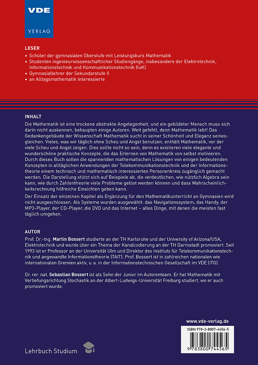 Die Mathematik ist eine trockene abstrakte Angelegenheit, und ein gebildeter Mensch muss sich darin nicht auskennen, behaupten einige Autoren. Weit gefehlt, denn Mathematik lebt! Das Gedankengebäude der Wissenschaft Mathematik sucht in seiner Schönheit und Eleganz seinesgleichen. Vieles, was wir täglich ohne Scheu und Angst benutzen, enthält Mathematik, vor der viele Scheu und Angst zeigen. Dies sollte nicht so sein, denn es existieren viele elegante und wunderschöne praktische Konzepte, die das Erlernen von Mathematik von selbst motivieren. Durch dieses Buch sollen die spannenden mathematischen Lösungen von einigen bedeutenden Konzepten in alltäglichen Anwendungen der Telekommunikationstechnik und der Informationstheorie einem technisch und mathematisch interessierten Personenkreis zugänglich gemacht werden. Die Darstellung stützt sich auf Beispiele ab, die verdeutlichen, wie nützlich Algebra sein kann, wie durch Zahlentheorie viele Probleme gelöst werden können und dass Wahrscheinlichkeitsrechnung hilfreiche Einsichten geben kann.Der Einsatz der einzelnen Kapitel als Ergänzung für den Mathematikunterricht an Gymnasien wird nicht ausgeschlossen. Als Systeme wurden ausgewählt: das Navigationssystem, das Handy, der MP3-Player, der CD-Player, die DVD und das Internet - alles Dinge, mit denen die meisten fast täglich umgehen.