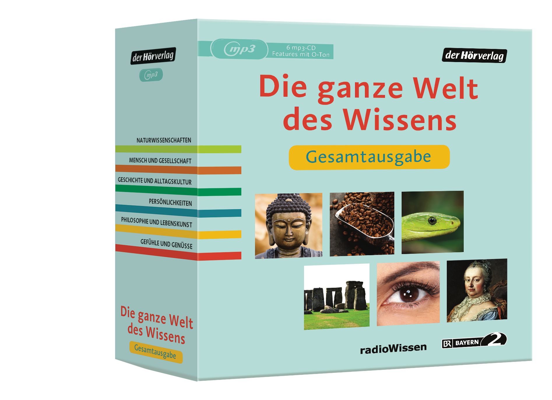 Die ganze Welt des Wissens versammelt in einer Box, das macht sechs voll gepackte MP3-CDs mit 128 hochwertigen Features: aus der Feder von erfahrenen Rundfunkautoren, mit vielen Experten im O-Ton, Sounddesign und Musik.Enthält: - Wissenswertes aus der Geschichte, zum Beispiel über Alte Kulturen wie die Inkas oder Germanen, über Epochen wie das Mittelalter, über große Persönlichkeiten wie Julius Cäsar, Dschingis Khan und Marie Curie.- Naturwissenschaftliche Themen von Astronomie und Atomkraft über die Entstehung menschlichen Lebens bis zum Vulkanismus.- Aufschlussreiches über Mensch und Gesellschaft, über Alltagsgegenstände wie dasTelefonoder Parfüm, über Essen, Trinken, Schreiben und Lesen.- Philosophisches über Sokrates, den Sinn des Lebens oder Glücksgefühle.- Aspekte der Psychologie wie Persönlichkeitsforschung und Träume.- Glaubensfragen und Grundlagen der Religionen.- Besonderheiten aus der Tierwelt.(6 mp3-CDs, Laufzeit: 46h 25)