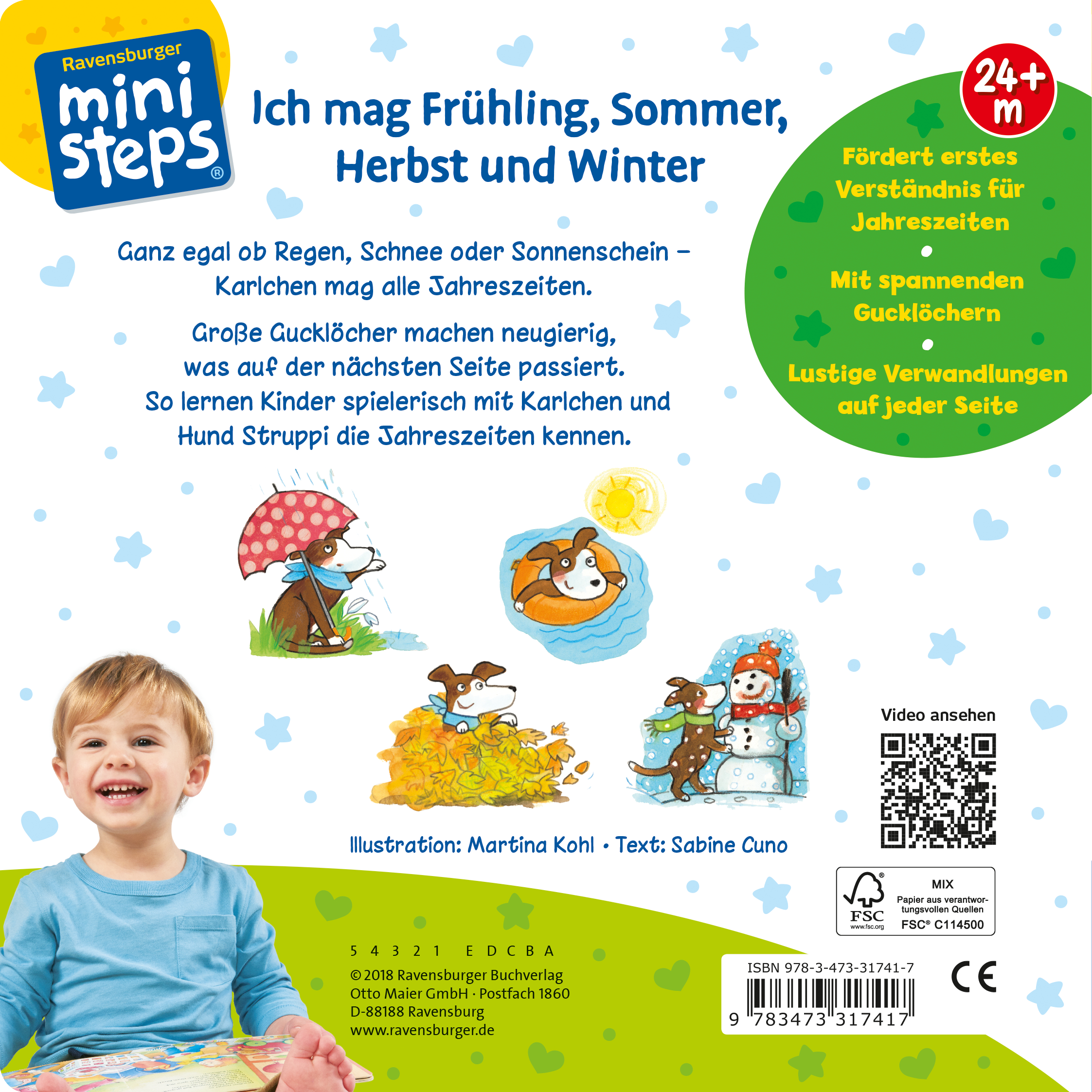 Gemeinsam mit Karlchen und Hund Struppi erleben Kleinkinder die vier Jahreszeiten. Sie begleiten die beiden beim Blumengießen, beim Drachensteigen lassen oder beim Schlittenfahren. Für Überraschungen sorgen dabei die großen Gucklöcher, deren ausgestanzte Teile auf der nächsten Seite in einer ganz anderen Szene auftauchen. Und dank der liebevollen, kurzen Reime werden die Kleinen schon bald begeistert mitsprechen.