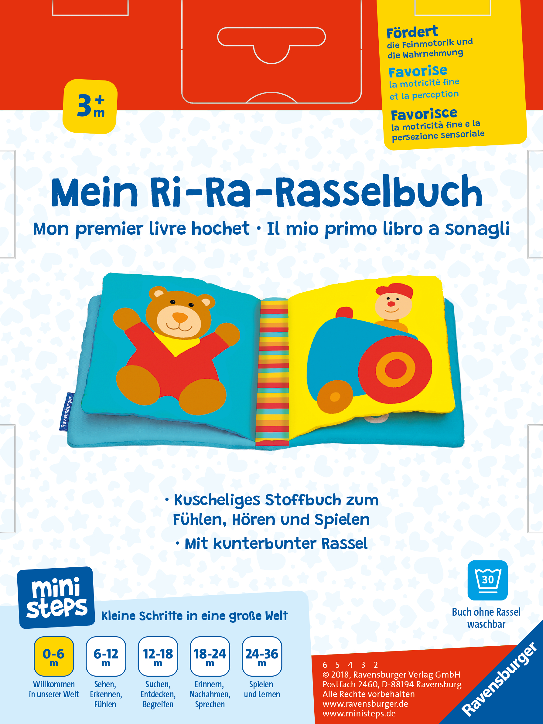 Dieses Stoffbuch ist Rassel und Buch in einem! Die Ringrassel ist mit einem Klettverschluss am Buch befestigt und dient als Greifling, Beißring oder Spielzeug. Die bunten Perlen und das Rasselgeräusch machen neugierig und animieren die Kleinsten zum eigenständigen Greifen. Kontrastreiche Motive wie Teddy, Ball und Ente sorgen für einfaches Wiedererkennen.