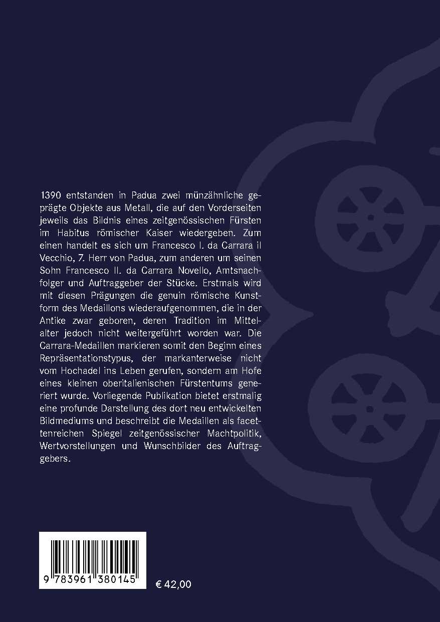 1390 entstanden in Padua zwei münzähnliche geprägte Objekte aus Metall, die auf den Vorderseiten jeweils das Bildnis eines zeitgenössischen Fürsten im Habitus römischer Kaiser wiedergeben. Zum einen handelt es sich um Francesco I. da Carrara il Vecchio, 7. Herr von Padua, zum anderen um seinen Sohn Francesco II. da Carrara Novello, Amtsnachfolger und Auftraggeber der Stücke. Erstmals wird mit diesen Prägungen die genuin römische Kunstform des Medaillons wiederaufgenommen, die in der Antike zwar geboren, deren Tradition im Mittelalter jedoch nicht weitergeführt worden war. Die Carrara-Medaillen markieren somit den Beginn eines Repräsentationstypus, der markanterweise nicht vom Hochadel ins Leben gerufen, sondern am Hofe eines kleinen oberitalienischen Fürstentums generiert wurde. Vorliegende Publikation bietet erstmalig eine profunde Darstellung des dort neu entwickelten Bildmediums und beschreibt die Medaillen als facettenreichen Spiegel zeitgenössischer Machtpolitik, Wertvorstellungen und Wunschbilder des Auftraggebers.