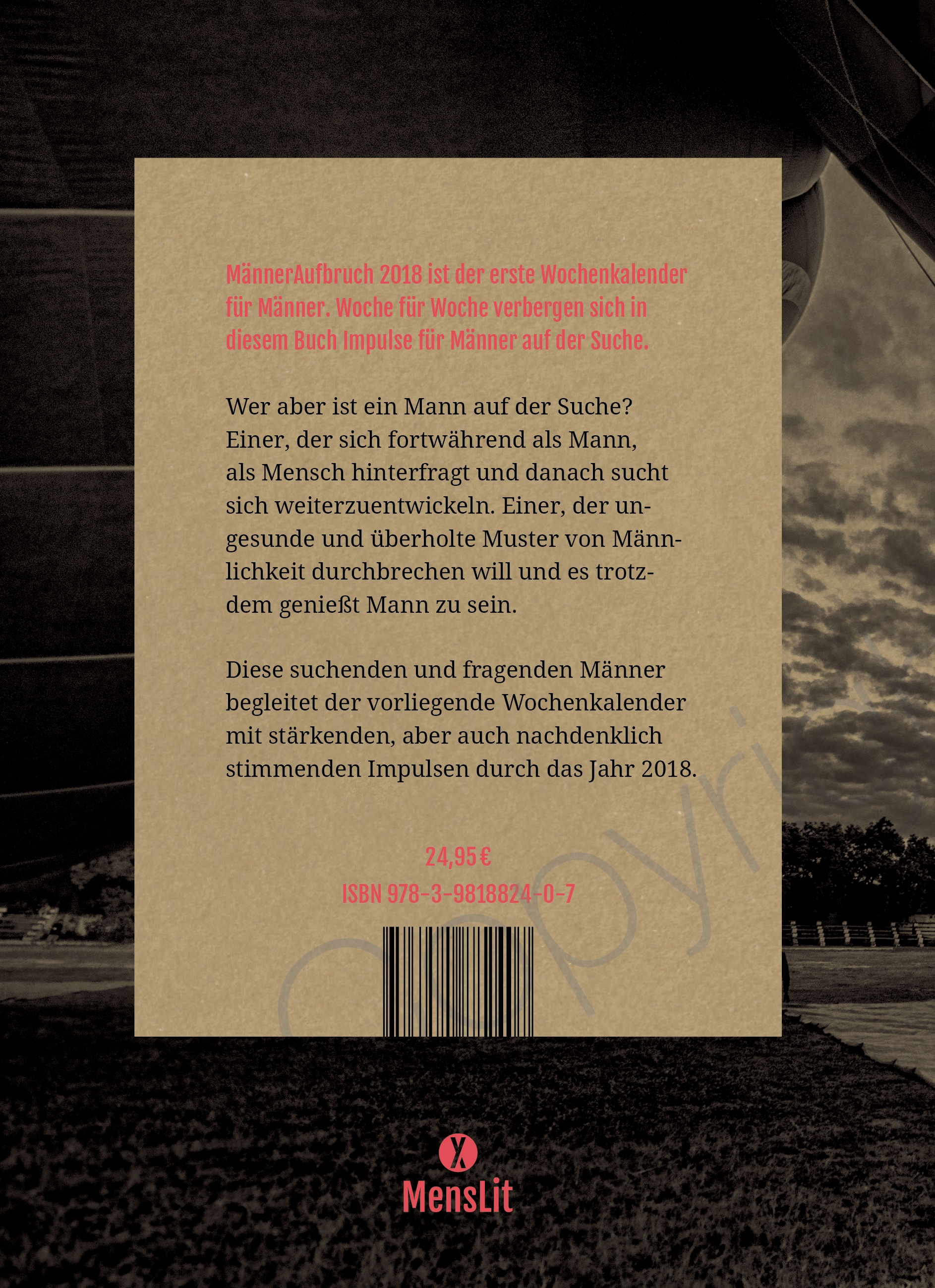 | Schlagworte | 52 Impulse • 52 Impulse für Männer auf der Suche • Der Kalender für Männer • Kalender für Männer • Männeraufbruch • Männer Aufbruch • Männeraufbruch 2018 • Männer auf der Suche • Männerkalender • Wochenkalender für Männer |