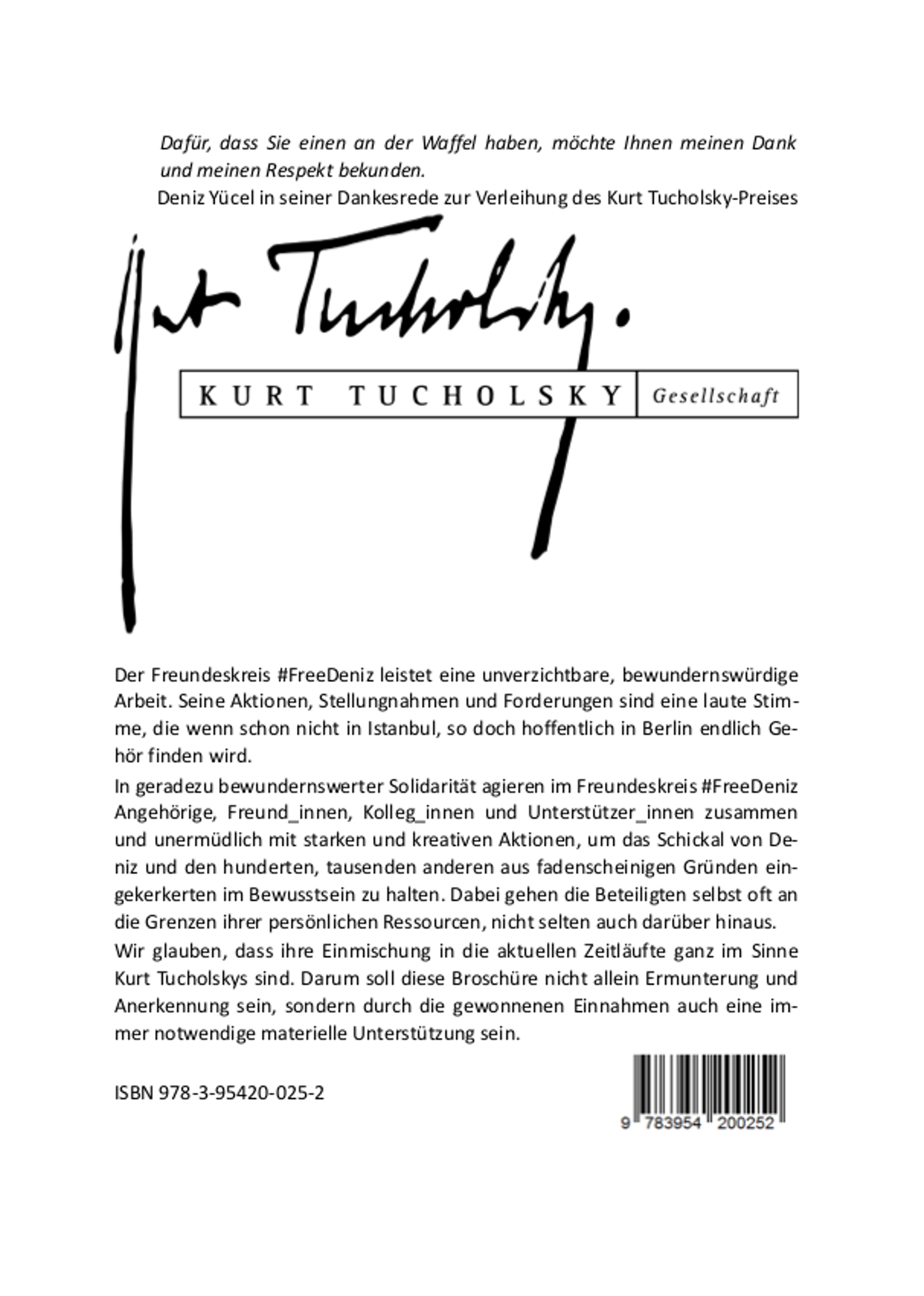 Wir glauben, dass ihre Einmischungen in die aktuellen Zeitläufte ganz im Sinne Kurt Tucholskys sind. Darum soll diese Broschüre nicht allein Ermunterung und Anerkennung sein, sondern durch die gewonnenen Einnahmen auch eine immer notwendige materielle Unterstützung sein.
