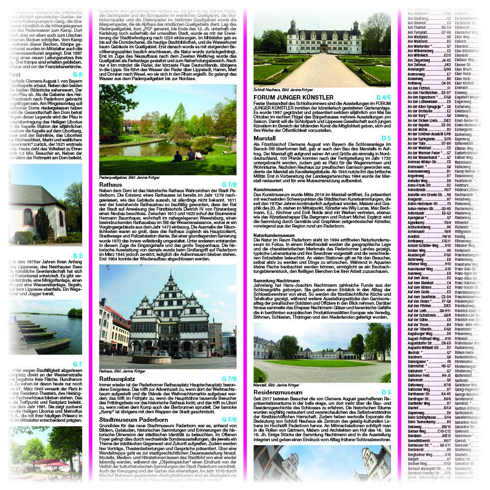 Jung und dynamisch mit langer Geschichte präsentiert sich die kleine Großstadt Paderborn ihren Besuchern. Die Universitätsstadt lockt mit zahlreichen Sehenswürdigkeiten und interessanten Museen. Bei einem Spaziergang durch das Paderquellgebiet mit seinen 200 Quellen im Herzen der Stadt, entlang historischer Gebäude wie Heisingsches Haus, Adam-und-Eva-Haus, Rathaus und nicht zuletzt dem imposanten Dom gibt es viel zu entdecken. Folgt man der Pader, dem kürzesten Fluss Deutschlands, gelangt man nach Schloß Neuhaus, zum gleichnamigen Schloss im Stil der Weserrenaissance mit herrlichem Barockgarten. Mit dem touristischen Stadtplan Paderborn lässt sich die Stadt perfekt entdecken. Das Straßen- und Sehenswürdigkeitenverzeichnis, eine Innenstadtvergrößerung und die Umgebungskarte sorgen für eine optimale Orientierung.