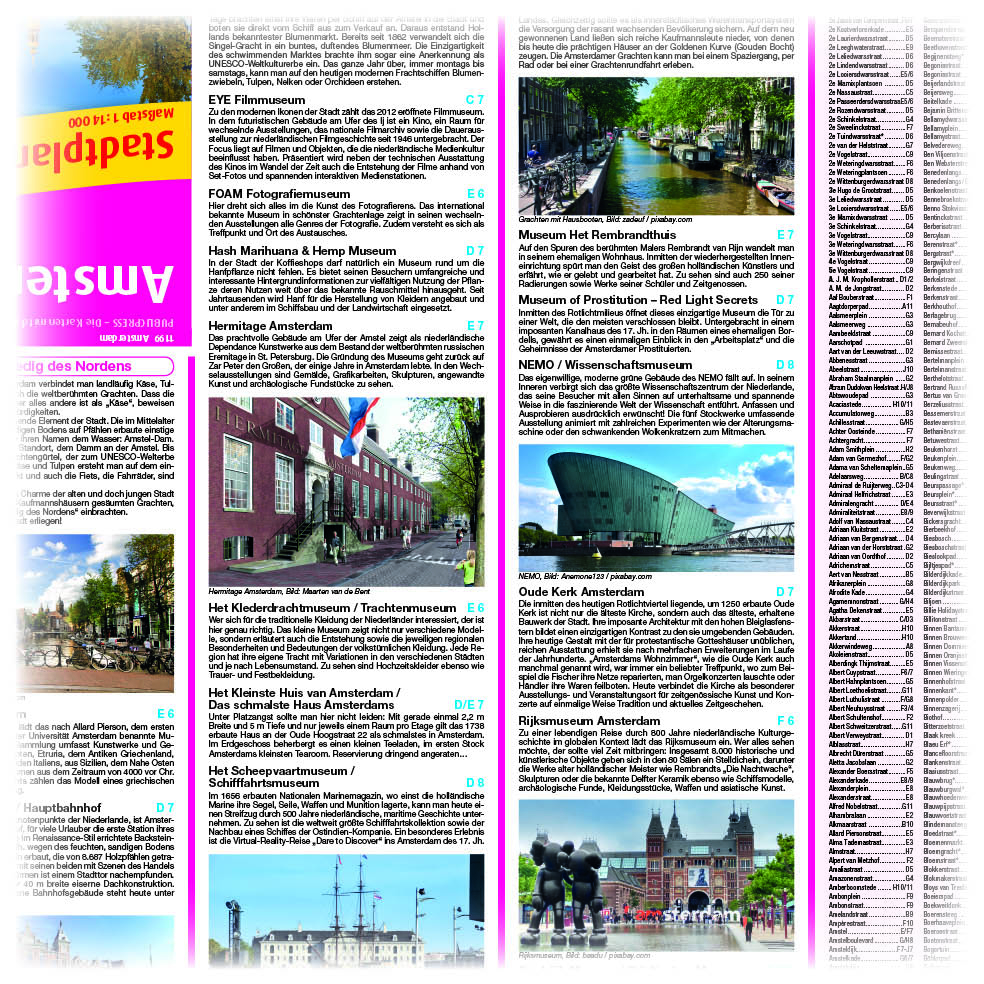 Kaas, tulpen, fiets - dass die niederländische Hauptstadt alles andere ist als "Käse", beweisen zahllose Museen und Sehenswürdigkeiten. Entdecken Sie den gemütlichen Charme der einst auf Pfählen erbauten Fischersiedlung, die von prächtigen alten Kaufmannshäusern gesäumten Grachten, die ihr die Bezeichnung "Venedig des Nordens" einbrachten. Sie werden dem Zauber der Stadt erliegen!Der Touristische Stadtplan hilft Ihnen mit Straßen- und Sehenswürdigkeitenverzeichnis, Innenstadtvergrößerung und Umgebungskarte sowie Infos zu den wichtigsten Sehenswürdigkeiten bei der Orientierung.